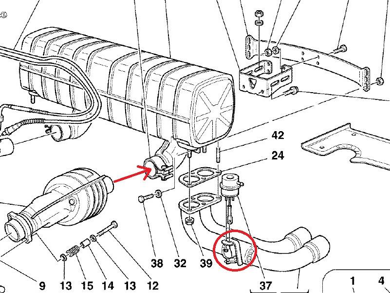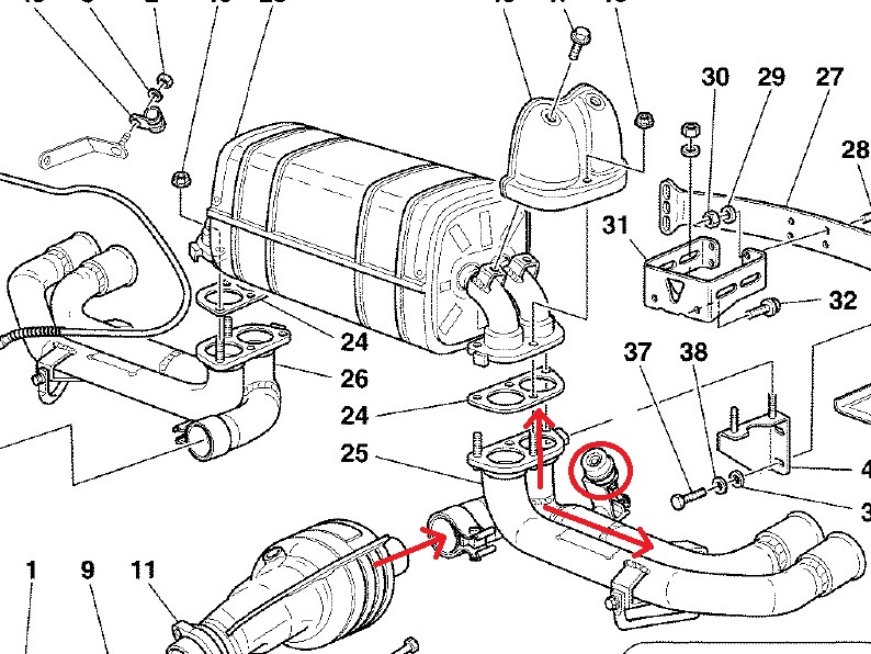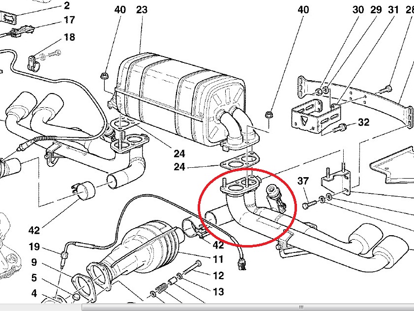 Next lets look at a Stradale Exhaust. You will see that the gases pass from the catalytic converter and into the tail pipe. There is a valve (circled) on one of the tail pipes. When this valve is closed (low engine speeds) the design of the tail pipe means that the gas is diverted up into the silencer and then out of the other tail pipe. When the valve opens, the gas is allowed to bypass the silencer and vents directly out – this gives the trademark Stradale “bark”.