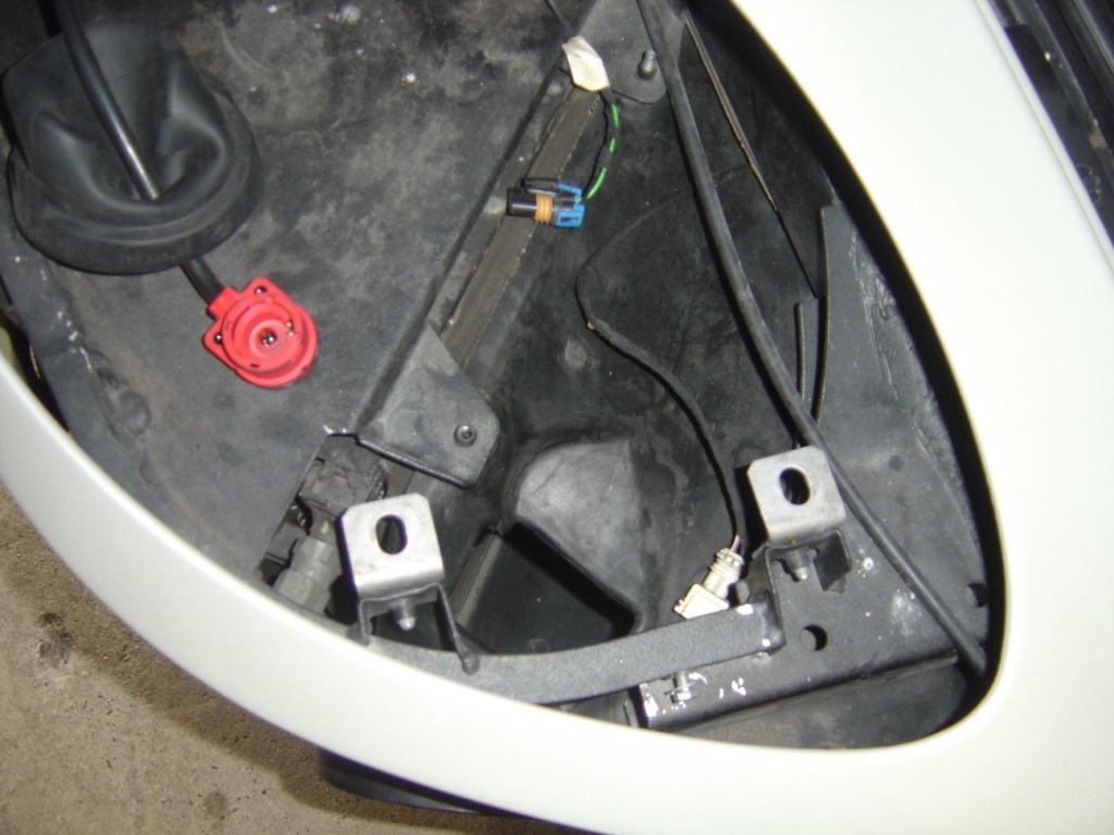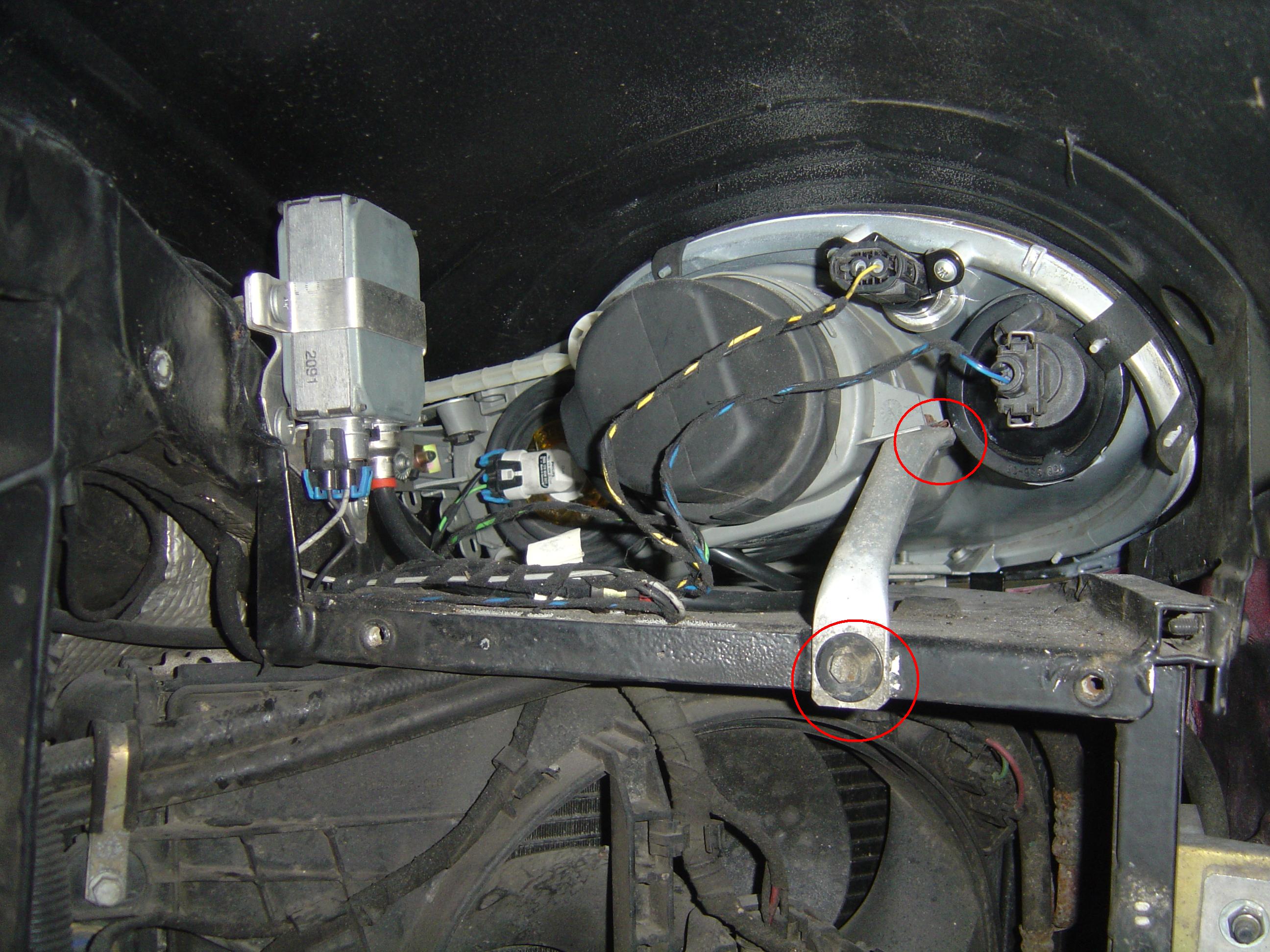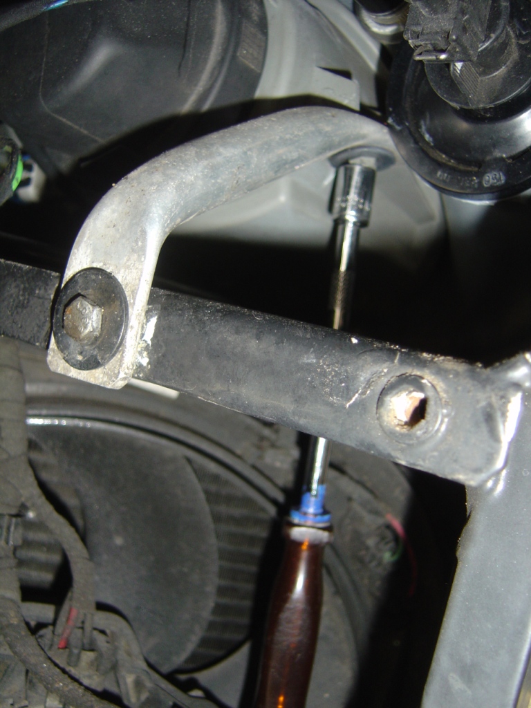 Finally, there are two bolts holding the front of the headlight to the radiator frame (the front bumper will need to be removed). I have shown a picture of their holes with the headlight removed in order to best show their location: