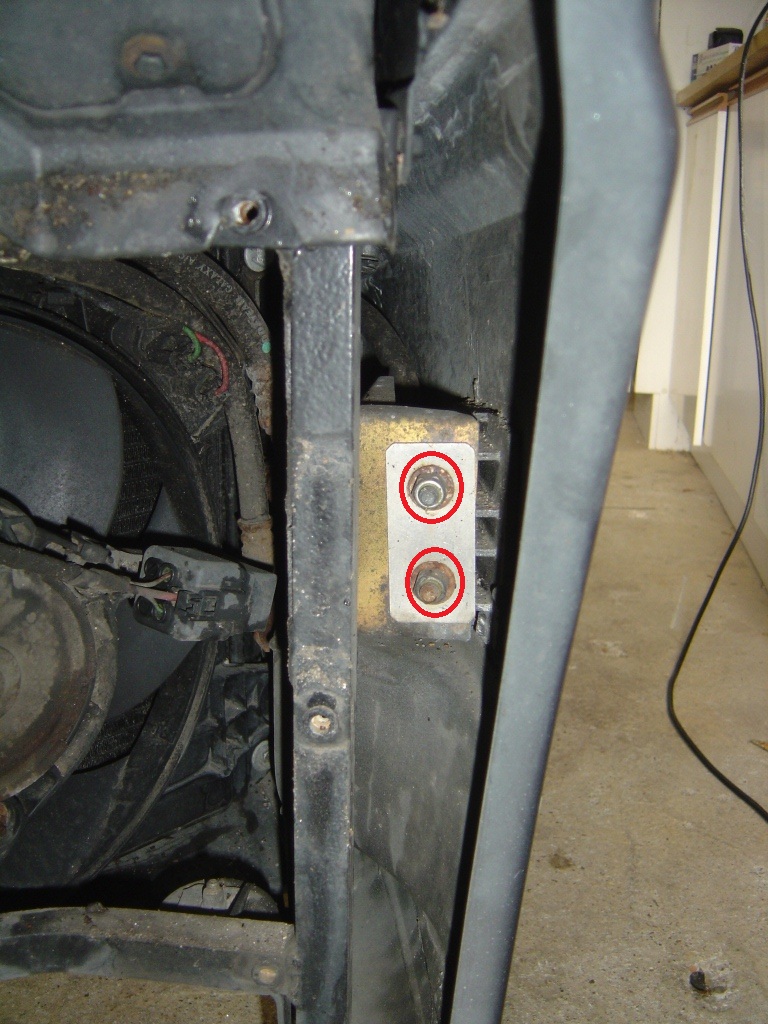 Next remove the two 13mm nuts that hold each side of the bumper to the radiator frame (retain the nuts, washers and rectangular spacing plate):