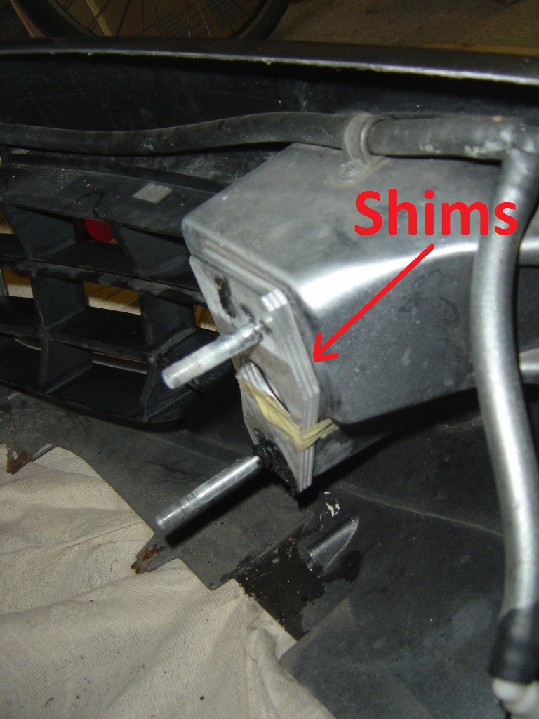 The shims are actually on the M10 bolts that are undone from inside the front trunk. The M8 bolts holding the edges of the bumper in place are not shimmed – they attach to an adjustable bracket.