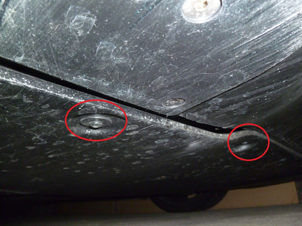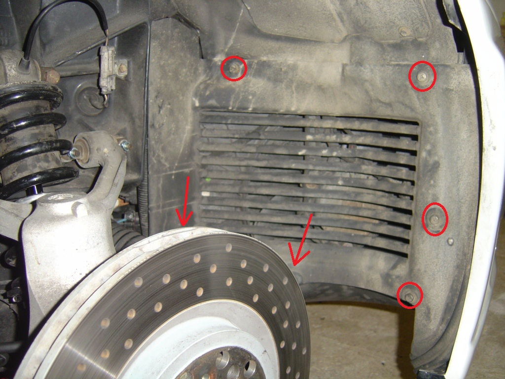 First of all you need to remove the front splash guards. Access is much improved if you remove the wheels beforehand. Note that you can remove one side at a time and put the wheels back on before moving to the next step if you don’t have the space to raise the front of the car up. The splash guards are held in place with six screws, four of which are circled in the picture below and two are behind the hub in the picture (if anyone has a better photo please do send it to me!).
