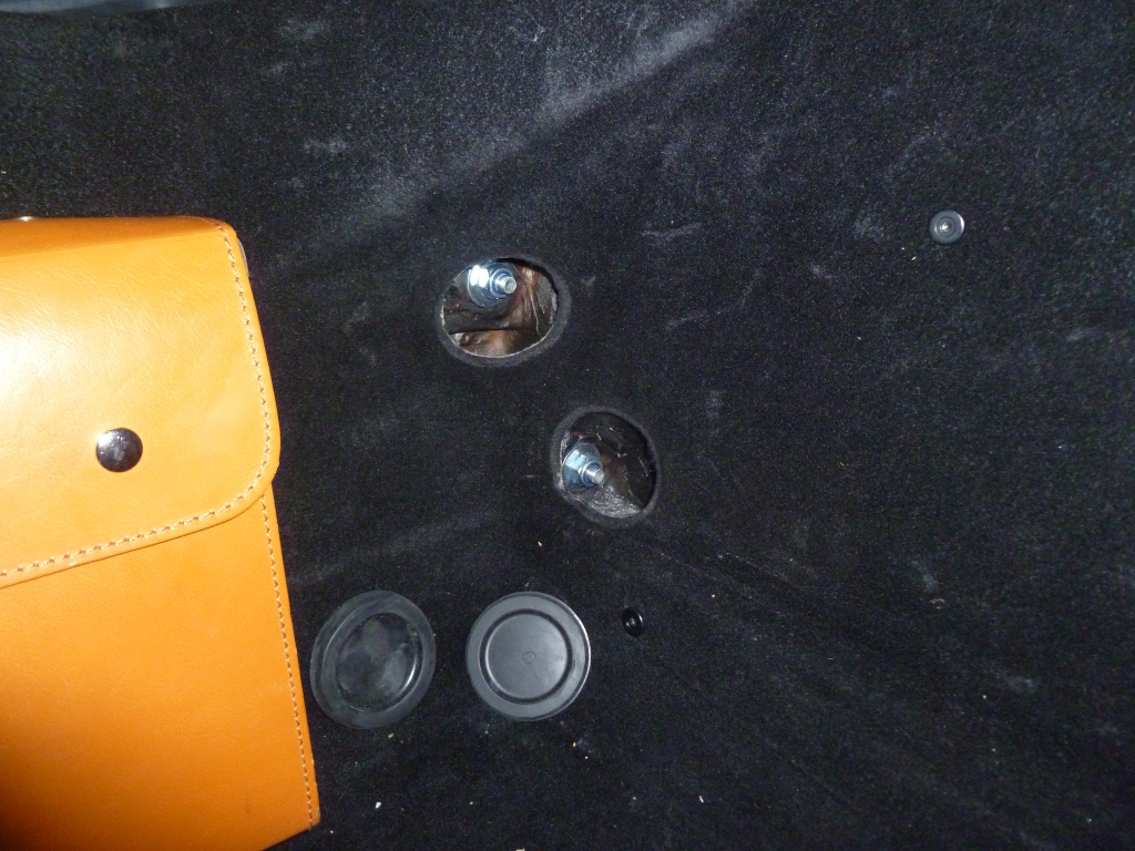 Working inside the front compartment, remove the four rubber grommets that give access to the main bolts (two either side of the tool kit). Undo these (17mm):