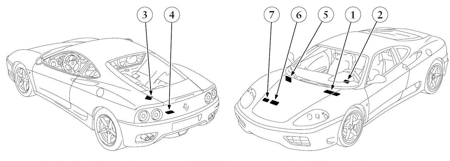 6. ECE Approval. This plate is found inside the front hood and displays the ECE regulations issued by the Economic Commission for Europe which apply to different parts fitted to the car (non euro spec cars wont have this plate fitted). The top line shows the different chassis designations and which of the regulations listed apply to that chassis. The chassis designations are: