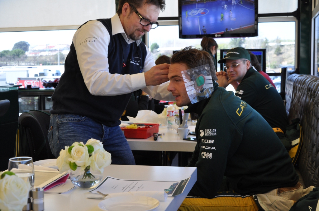 During lunch we were joined by the drivers who both had earphone mouldings fitted. A small speaker was inserted into their ear and a two part “expoy” was injected over their ear and covered with a piece of clear plastic sheet. They then had to put on their balaclava and helmet whilst holding still for 10 minutes until the glue had cured.