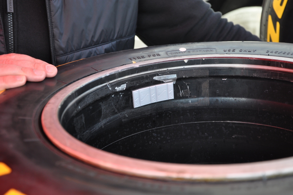 In the afternoon the team race a full race simulation. After one of the pit stops I noticed that one of the tyres had a serious flat spot that was bad enough for the wires to be poking out. As I was about to take this photo the Pirelli engineer put his hand over the area in question!