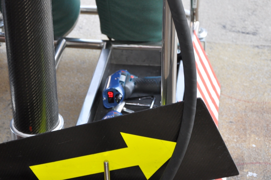 Another interesting bit of trivia that I noticed was the way the team performed front wing adjustment. They had special drivers that had a dial at the rear of them – they would dial in the number of turns they wanted the front wing changed by and when they put the driver onto the adjuster it would turn it by the exact amount. During the race simulation one of the mechanics practiced the adjustment on the spare wing in the garage.