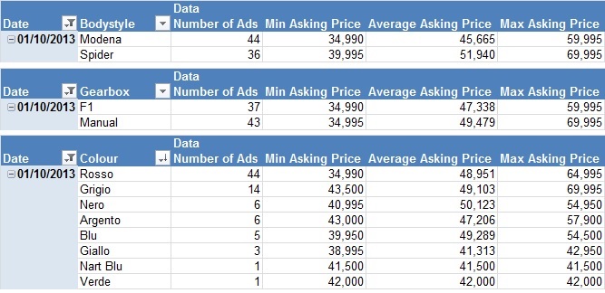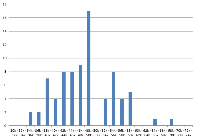 One thing I’ve been trying to look at since last month is showing how the asking prices are distributed. As such I put each asking price into a £2k bracket and plotted a crude histogram. As you can see prices are highly concentrated in the late £40k’s.