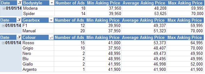 It will be interesting to see what happens in the coming months. Personally I think that the bottom of the 360 market has been and gone and prices will remain firm for a while. Another factor to keep an eye on is how much mileage creeps up. Since I started collecting the data, the median mileage of cars for sale has been around 24k (see table below). As the cars get used and mileages increase the effect on prices will be worth noting, especially once the 30k barrier has been breached.