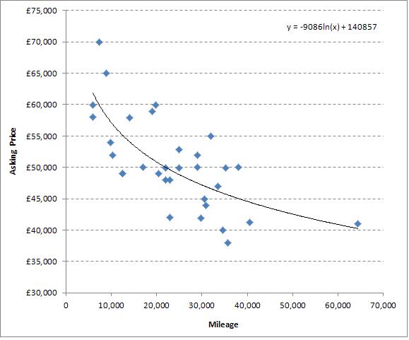 Here is the table of mileage vs average asking price as per the line of best fit. As the cheaper cars have dropped out of the data prices have crept up along the curve.