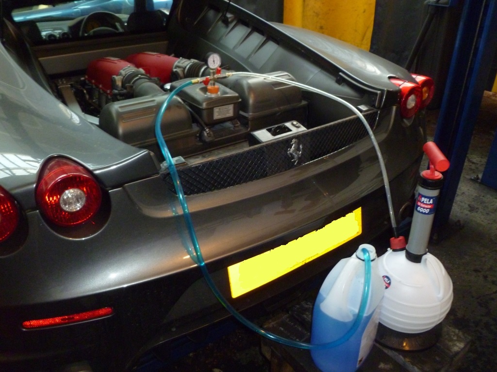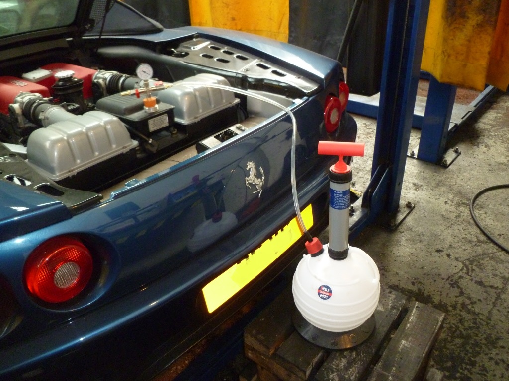 Just draining the radiators releases about 6 litres of coolant (both models hold approximately 17 litres). In order to get more out we used Valerio’s kit to gently blow compressed air into the system whilst the drain plugs were open. We managed to get 9 litres out of the 360 and 11 litres out of the F430.