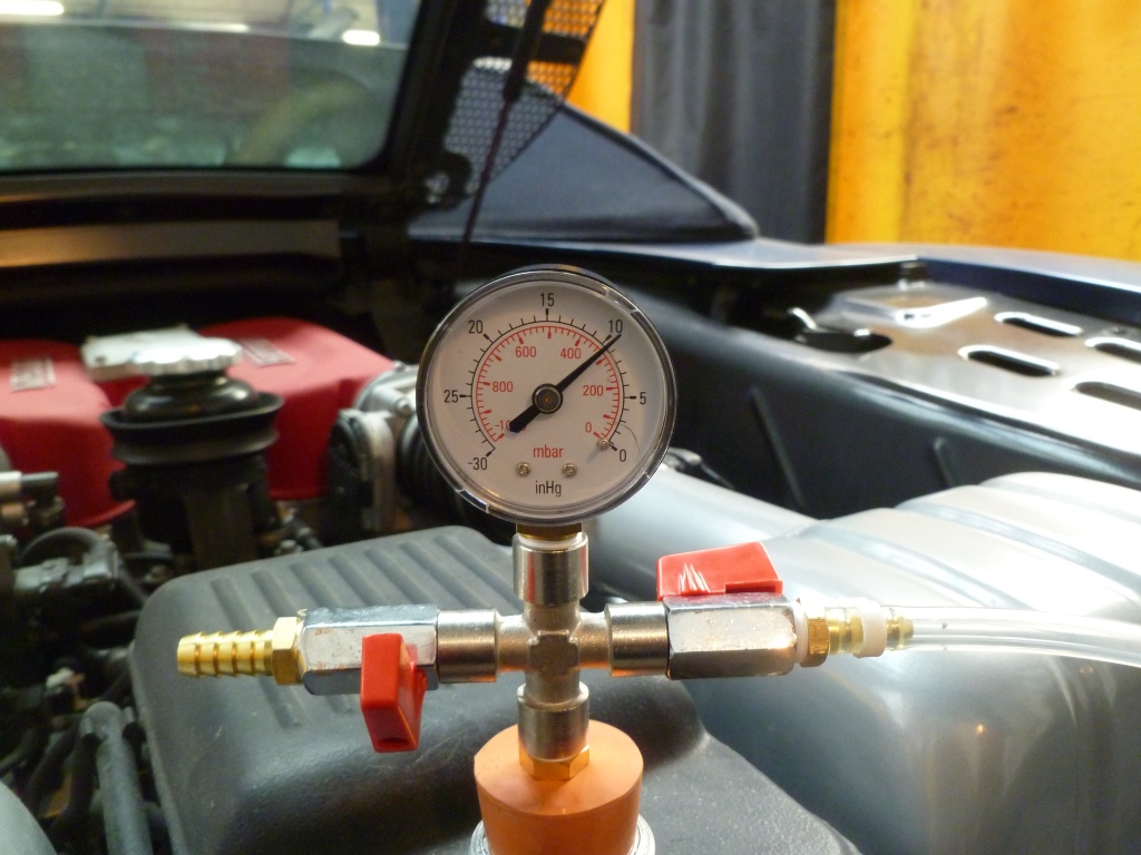 Next we re-fitted the drain plugs and used the kit to pull a smallish vacuum from the system. We left it under the vacuum for 5 mins in order to check for leaks (which would have been evidenced by the gauge dropping).
