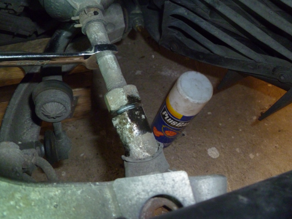 Before removing the bolt loosen the locking nut on the steering rack – you’ll need a 13mm spanner to hold the rack rack and a 22mm spanner on the lock nut.