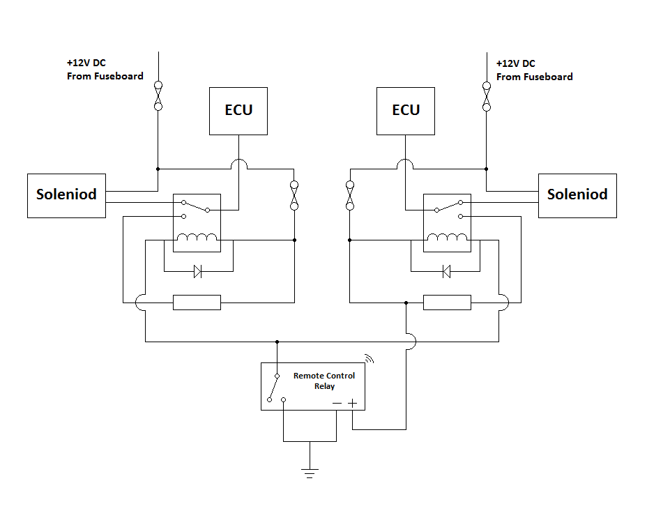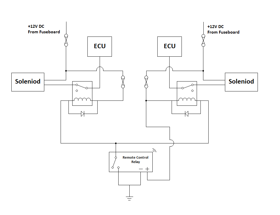 Essentially I am using two changeover relays to interrupt the connection between the ECU and the solenoid. Instead of just breaking the connection I switch the ECU to a load resistor – this fools the ECU into thinking that it is still connected to the solenoid and prevents any errors from being logged.