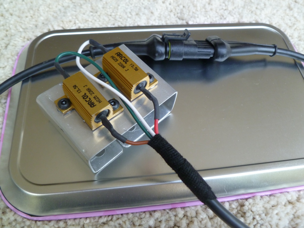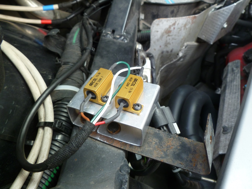 In order to ensure this didn’t happen again I went back to the drawing board. I replaced the ceramic resistors with ones clad in an aluminium heatsink. I also remote mounted them on a custom bracket so they were in the free air of the engine bay. I selected to use Arcol HS25 which are capable of dissipating 25W at 25ºC. I also increased the resistance to 220 ohms in order to reduce the heat dissipation by a factor of ten.