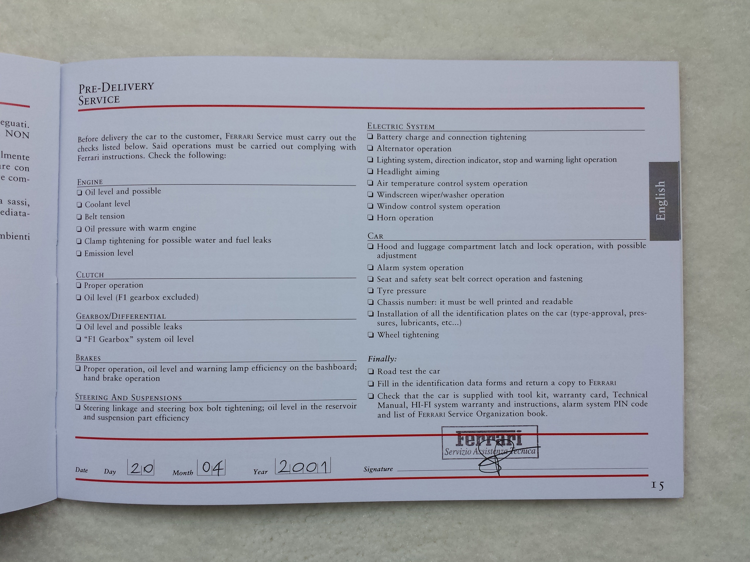 I guess in the UK the stamps in the book are necessary to list it as having a FSH (full service history). Here in the US it seems that the only one that gets stamped is the PDI (pre-delivery inspection) — dealers usually don’t bother to stamp any others. Here the possession of the service receipts are usually good enough for a prospective buyer which is why most owners (me included) keep all the receipts and put them in a three ring binder. It’s a real pity that Ferrari don’t do what every other manufacturer does (well here in the US anyway) and that is to maintain a national data base of all the service and repair work. I’m not sure if they do that now. My wife’s Lexus doesn’t even have a service book. If I am looking to purchase a used vehicle I can just give the dealer the VIN and he can look up to see what work has been done.