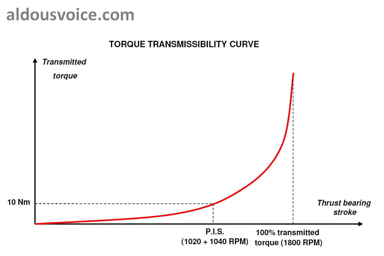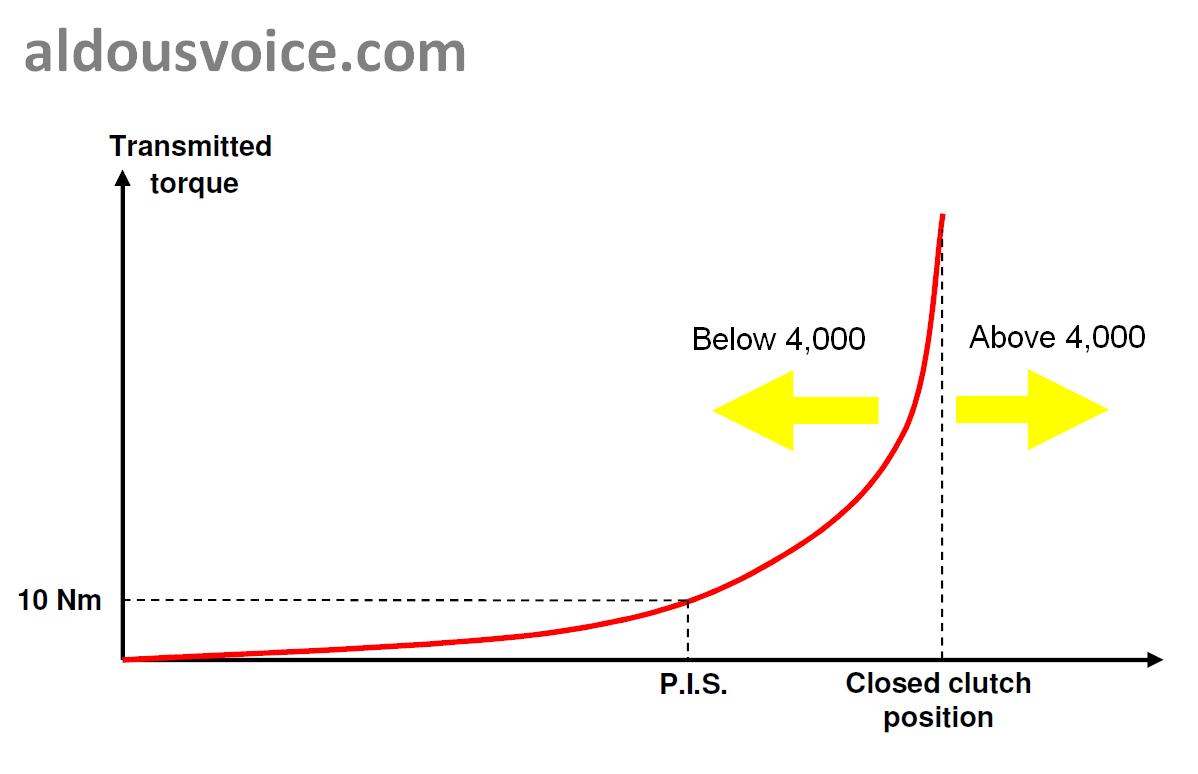 The TCU manages this operation using a Torque Transmissibility Curve, shown below. This curve shows the relationship between the clutch position (x-axis) and engine output (y-axis). As the driver increases the speed of the engine the clutch starts to close. When the clutch reaches the PIS the engine output is increased exponentially until the clutch is fully closed.