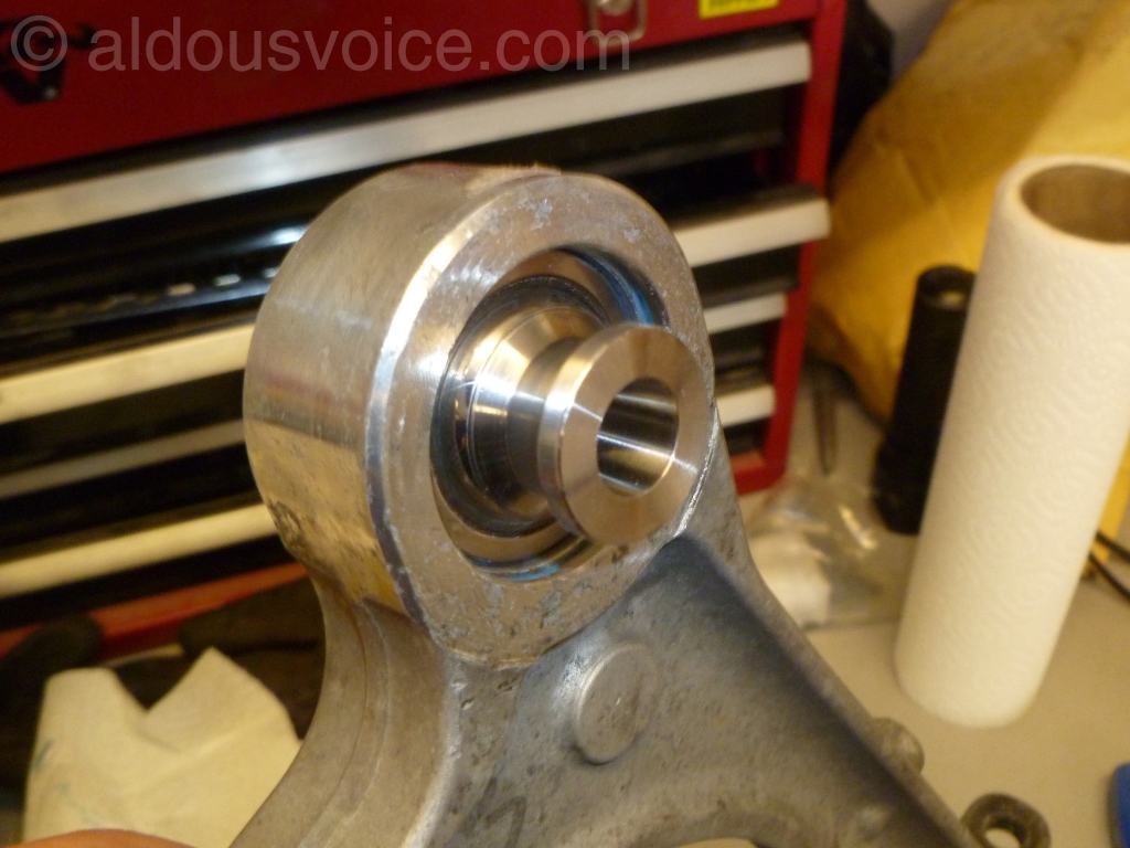 That is a very good question and one that I should have written up. I get the bolt started in the threads without worrying about letting the balancing spacer drop down. Once the bolt is in the threads I use a pry bar to push the balljoint upwards – this pushes the balancing spacer back up into its proper place.