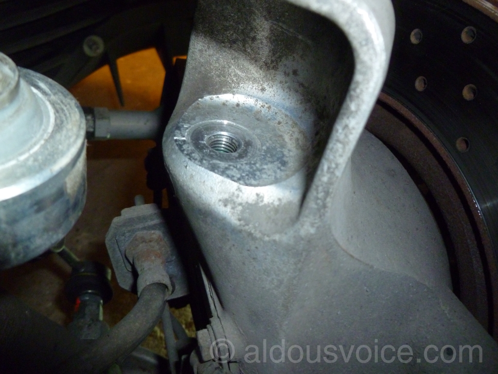 Next undo the bolt holding the hub to the wishbone. In this case I was attending to upper ball joints but if you need to replace the lower ones then the shock absorber needs to be detached from the wishbone first.