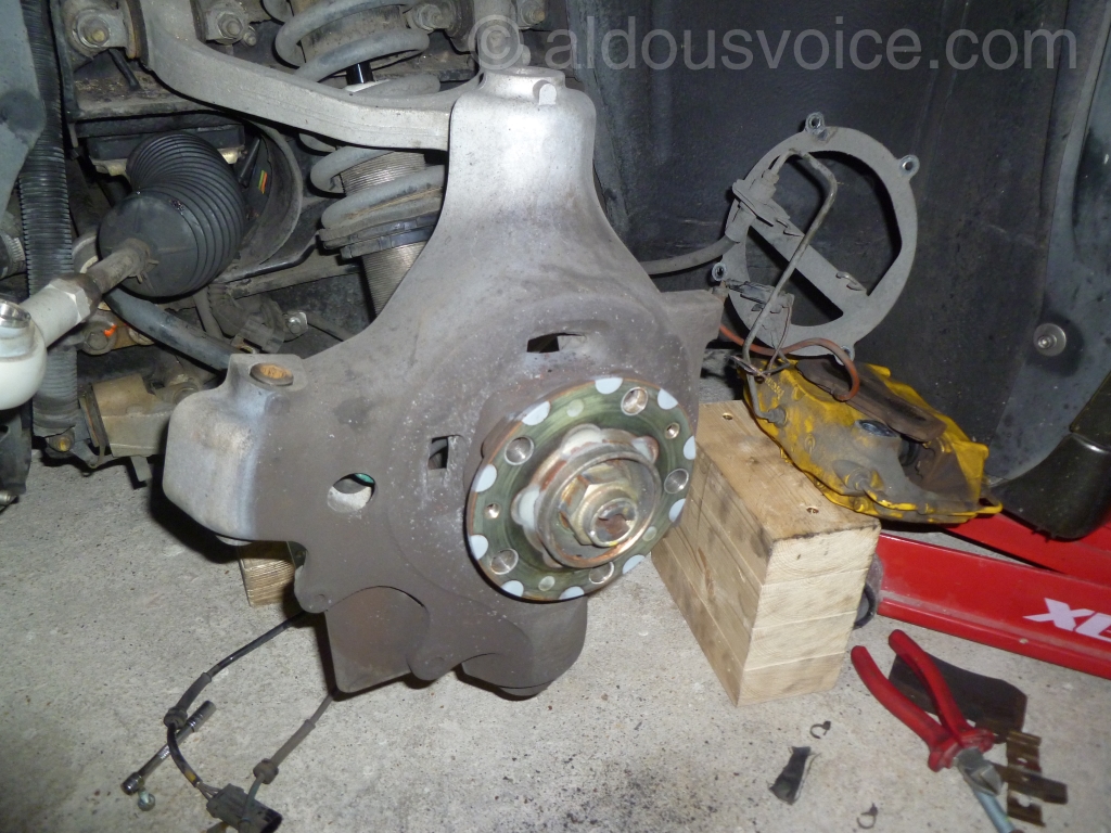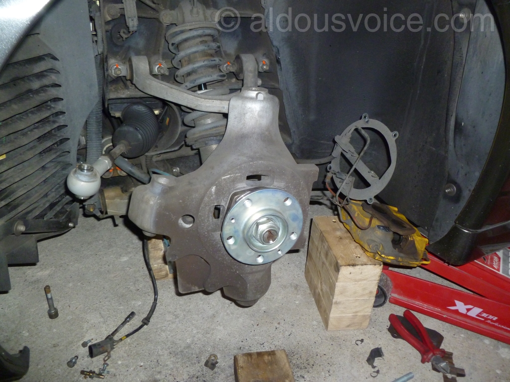 Loosen, but don’t remove, the two blots holding the hub to the upper and lower wishbone. You will need a 10mm hex bit for the upper bolt and a 14mm hex for the lower bolt (and a long bar as they are tight).