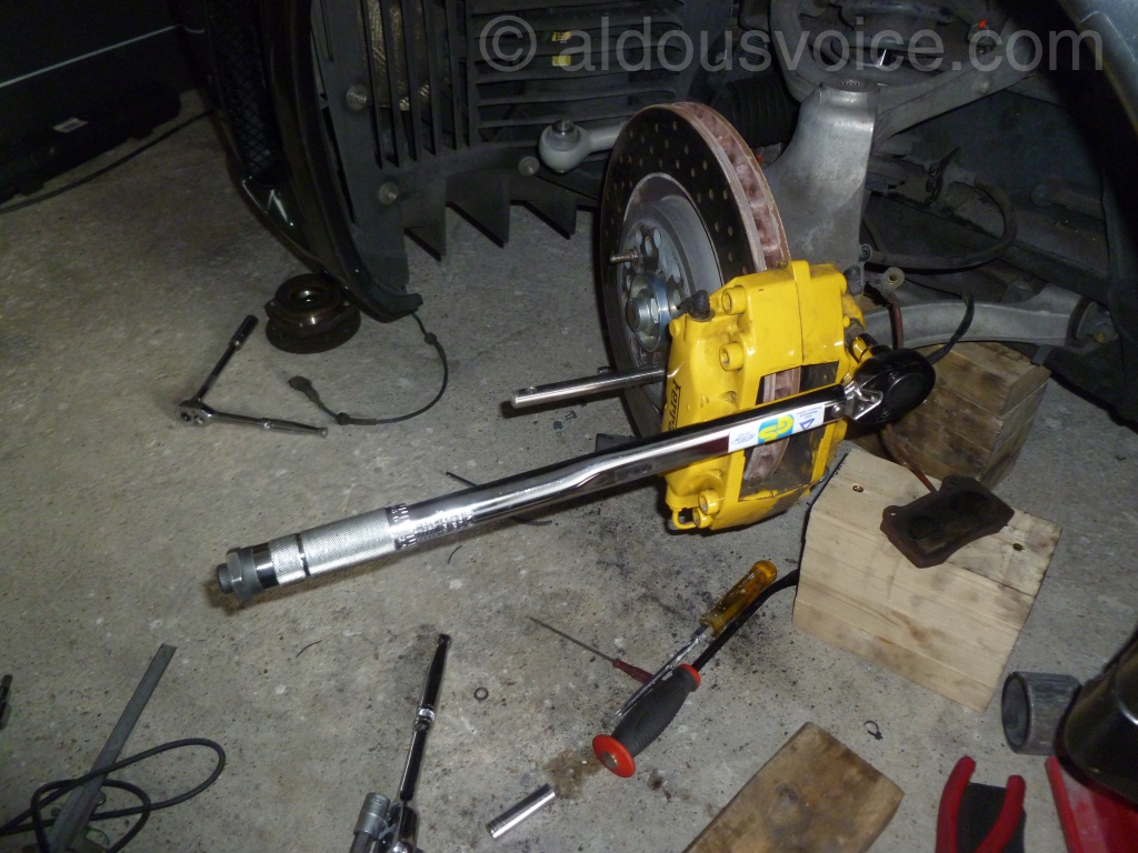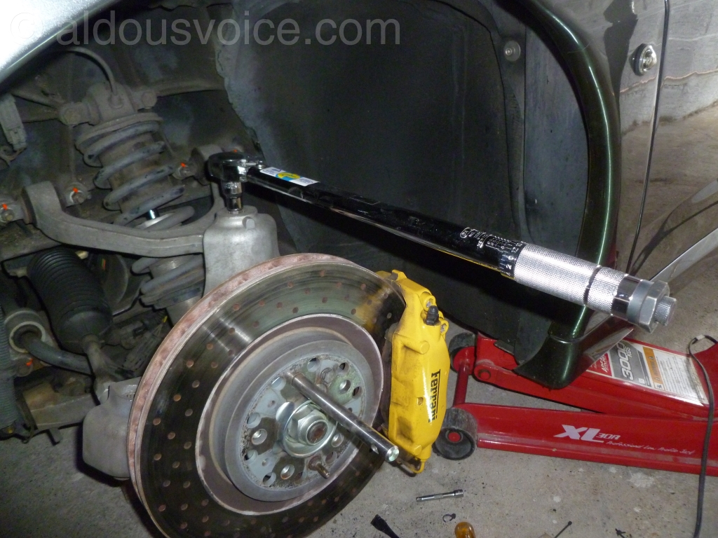 Now the hub nut needs to be torqued up. 275Nm is outside the range of most regular torque wrenches so you’ll need to find a long one from somewhere. Have an assistant press hard on the brake pedal (and apply the parking brake if working at the rear).