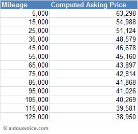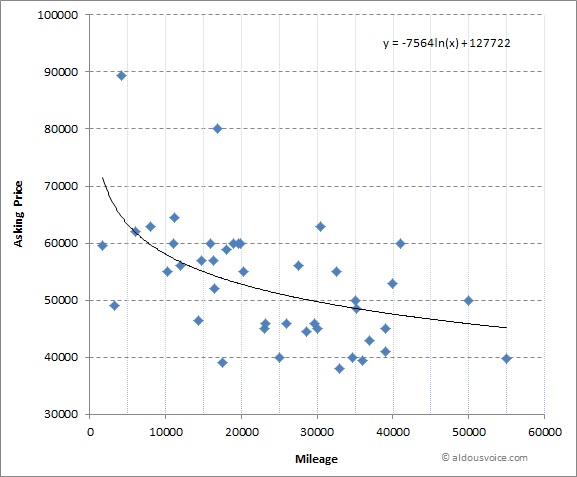 Here the plot of asking price vs mileage. Note the price madness has spread to several example with “high” miles on the odometer – it will be interesting to see how long these hang around at these levels.