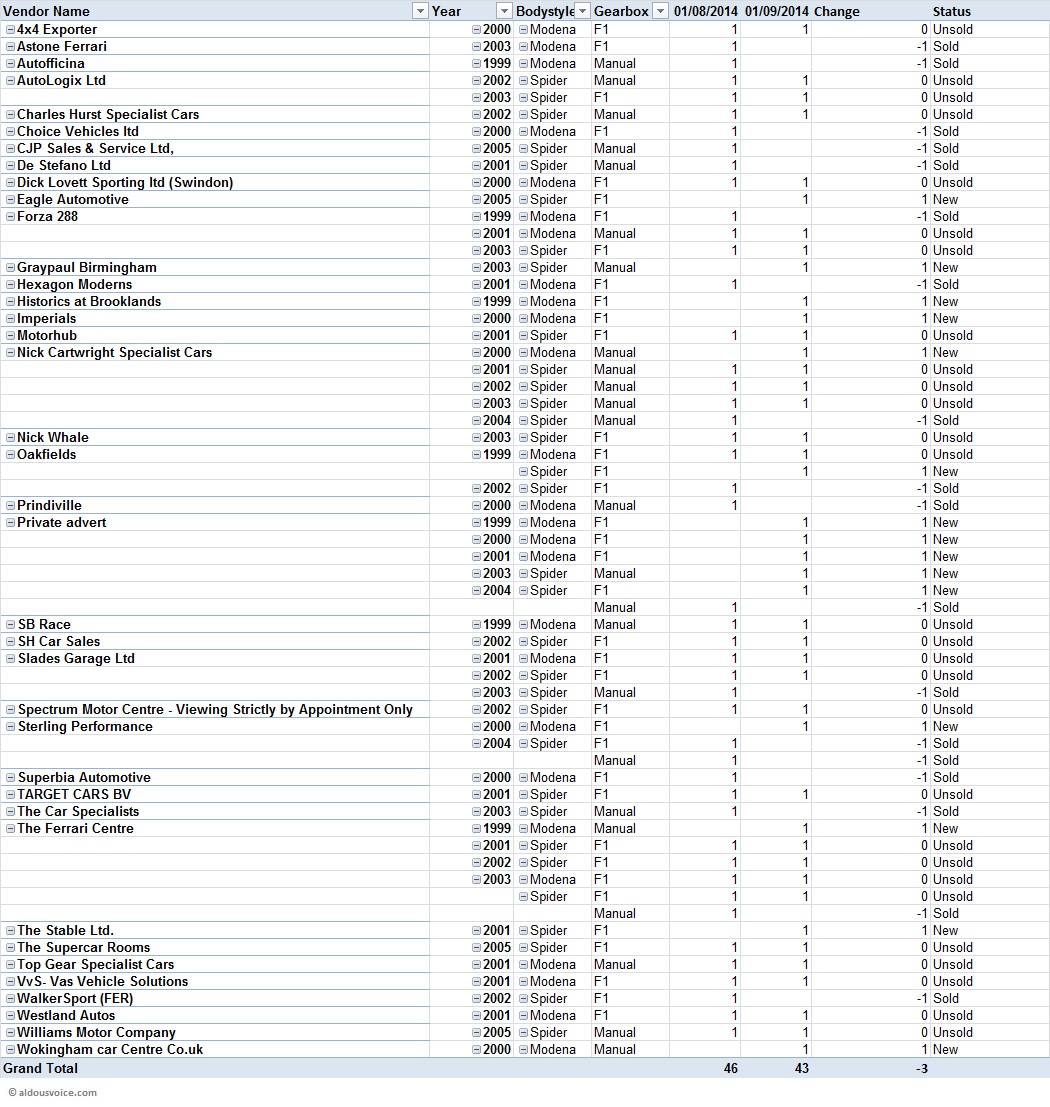 Finally, something new. I have tried to put together a table to gauge the activity in the market. This lists out the cars, by selling dealer from one month to the next to see if they are sold, unsold or new to the market. I make it 18 cars having dropped out of the market, 28 unsold and 15 newly listed.