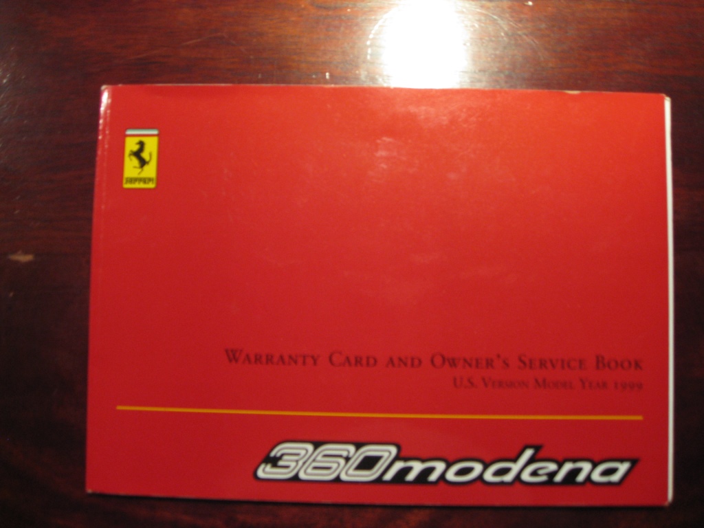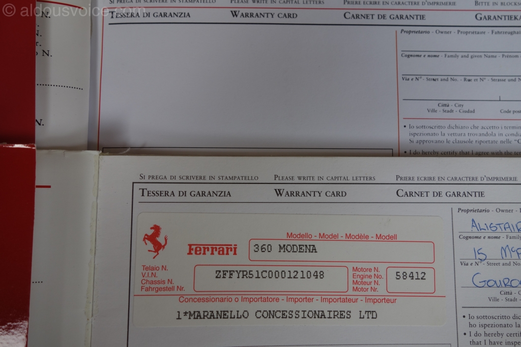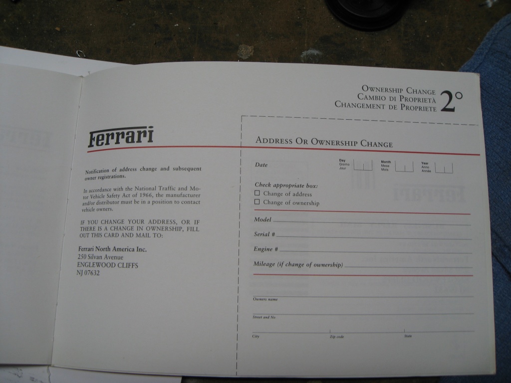 My service book for my 99 360 does have the Ferrari name embossed on the fold out flap attached to the cover. Also I have two pages that have VIN stickers so maybe here in the US the dealer only takes the third one. My front cover is different to yours (maybe Ferrari changed it on later models as mine is a very early one). Mine is only for the Modena and not for both the Modena and Spider. My Change of Ownership cards when removed leave a strip of paper along the top as well as at the RHS. Maybe these are because mine is a US model and you show a UK model book.