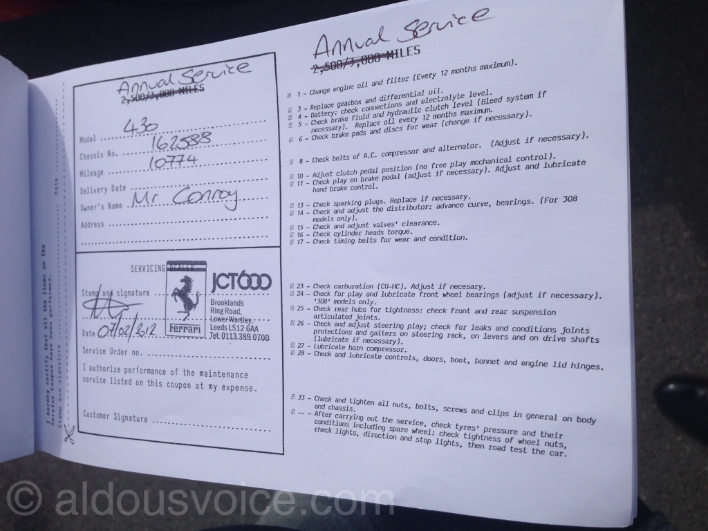 I correspond with many people from all over the world on Ferrari matters and the main reason people get in touch with me is to seek advice when buying into the marque for the first time. One such person passed me some pictures of the service book that was presented to him when viewing an F430 recently. He instinctively knew that the records weren’t correct and it’s not hard to see why – the booklet was an old 3X8 service record from the 1980’s which had been crudely edited with a pen. This car is still on the market in the UK right now, quite how the vendor has the gumption to present a car like this I don’t know.