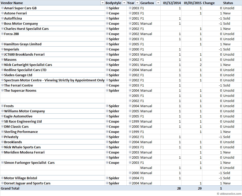 I have advised quite a few purchasers during 2014 and the overriding factor that pretty much all of them want is a manual gearbox (despite my efforts to convert them to love the F1!). I thought it would be useful to record the spread between manual and F1 gearboxes at the start of the year and see how it pans out. There is a small premium being asked for manual cars: