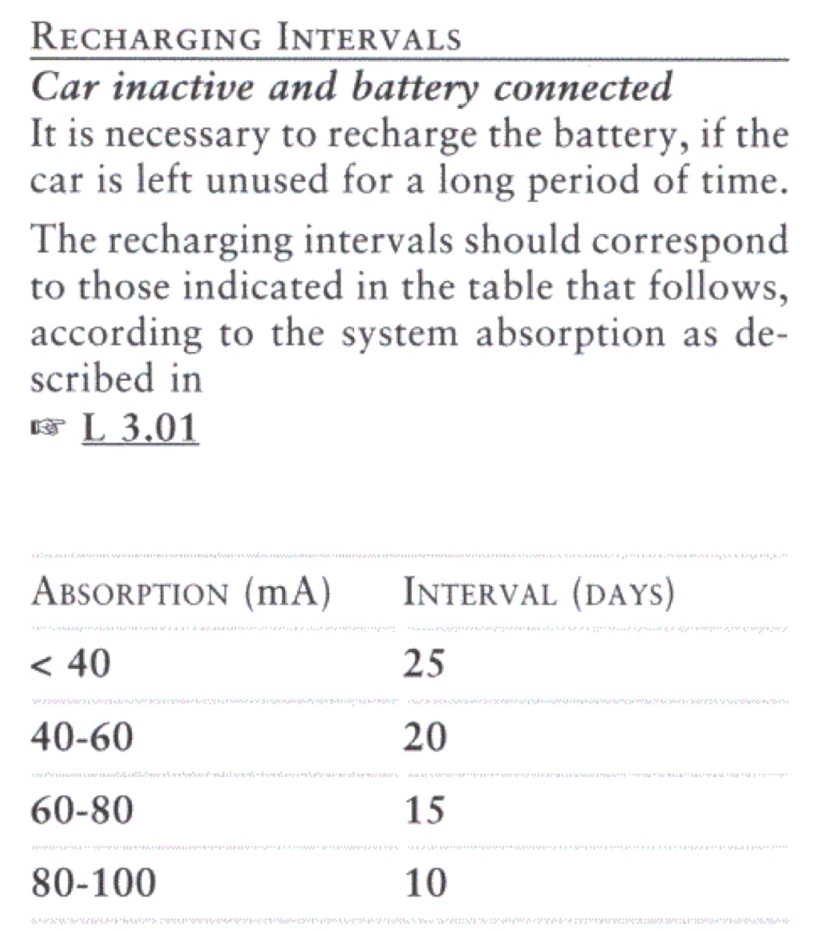 A 50mA draw in a “parked” state equates to an 8.3Ah drain over a week, which should be withstood easily by a healthy battery even if not connected to a tender. It should also be noted that the car in this article has the radio-controlled luggage compartment opener installed (link) which contributes ~8mA to the “parked” current draw (but not to the “battery OFF” current draw).