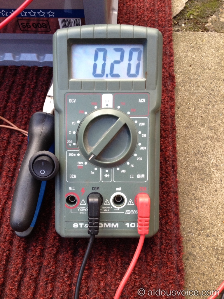 The second measurement to carry out is not prescribed by the Maintenance Plan but is, in my opinion, far more useful: the current draw with the car off and locked, but with the battery switch “ON”, which I think is how most of us leave our cars when not in use.