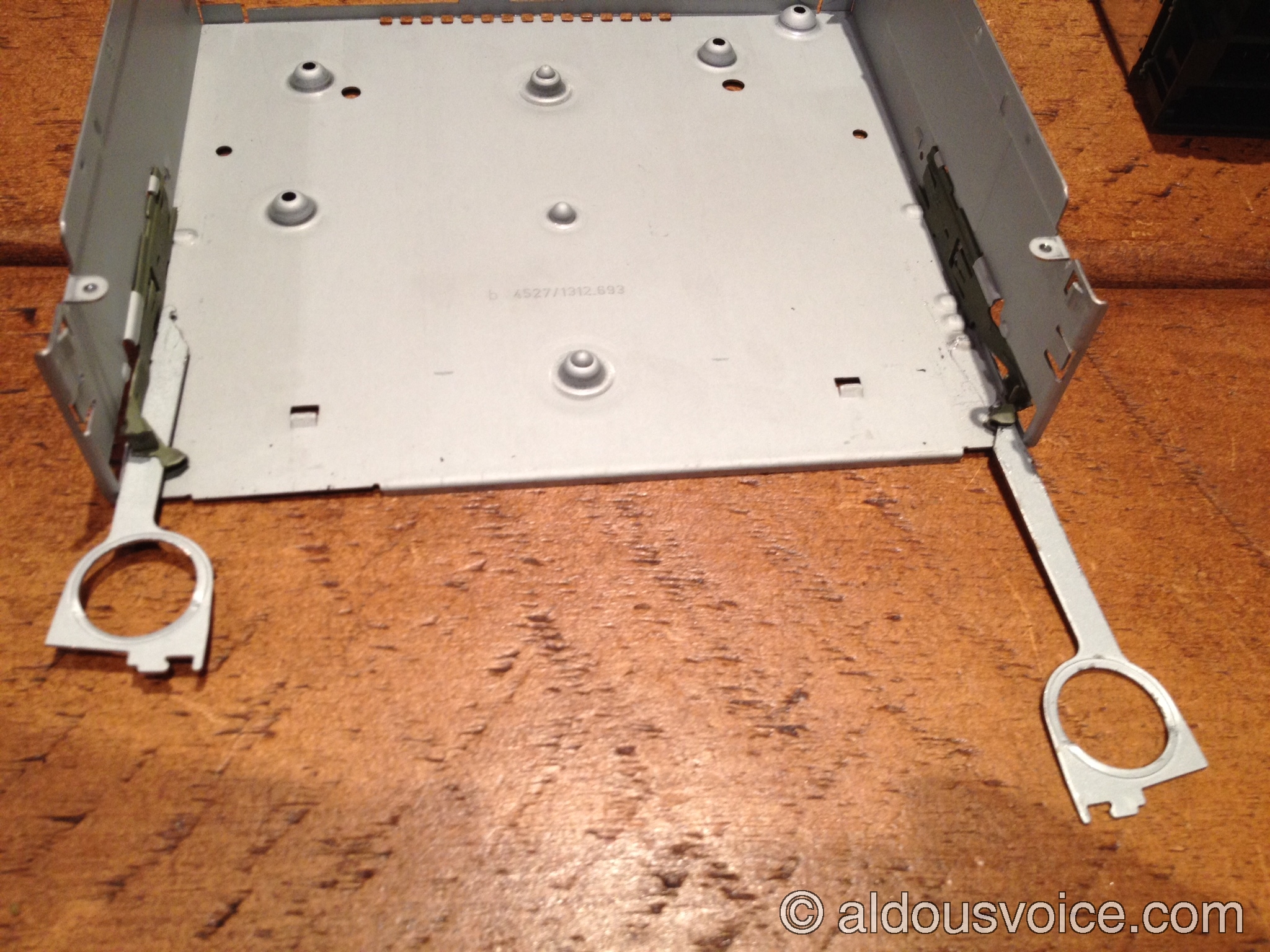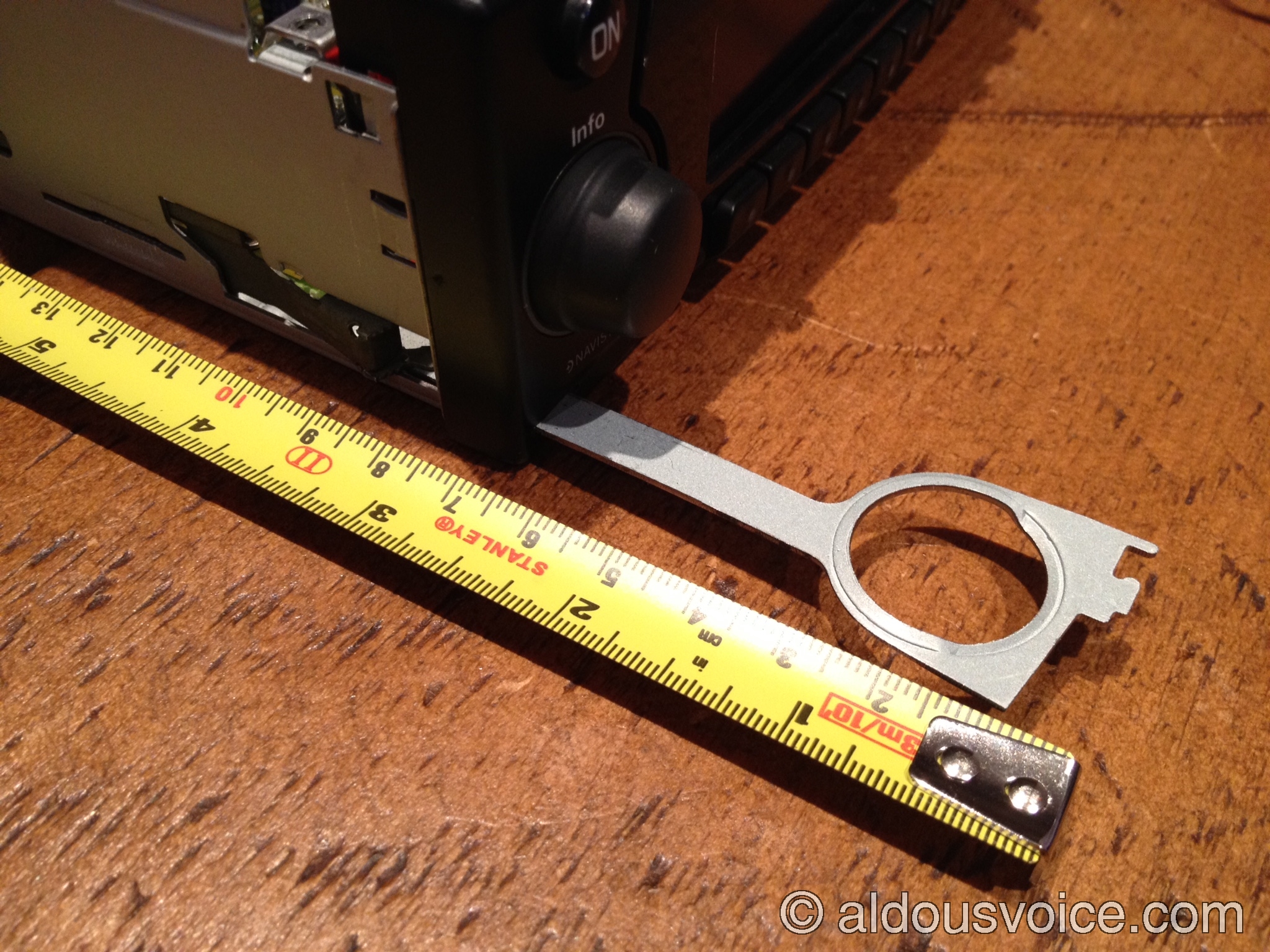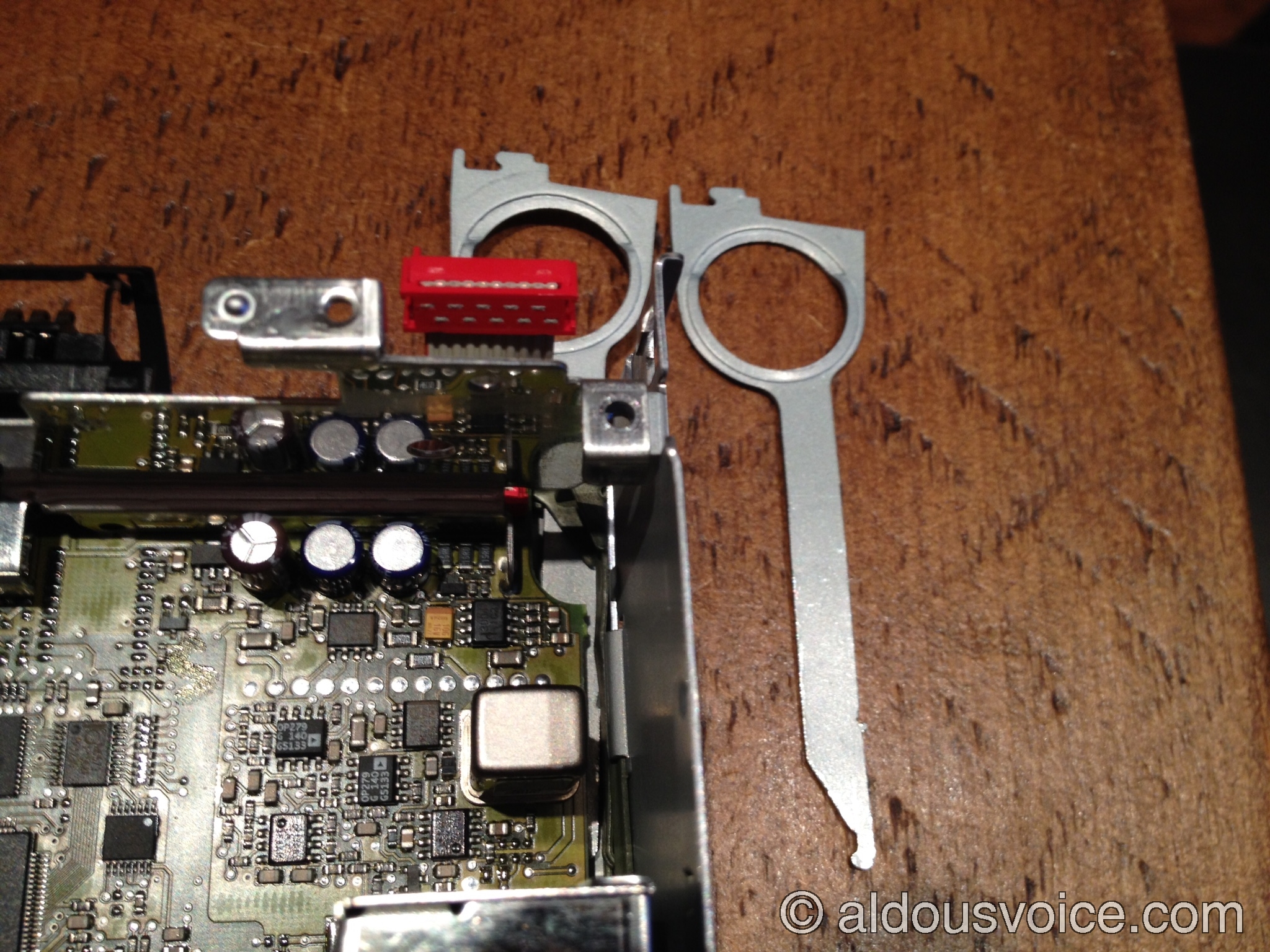 However, the layout of the head unit chassis is such that, with very little force, the removal keys can be pushed all the way in. This is shown in the photo below, where one correctly-engaged key is compared with a fully inserted one (shown with the head unit core electronics removed from the chassis, for clarity).