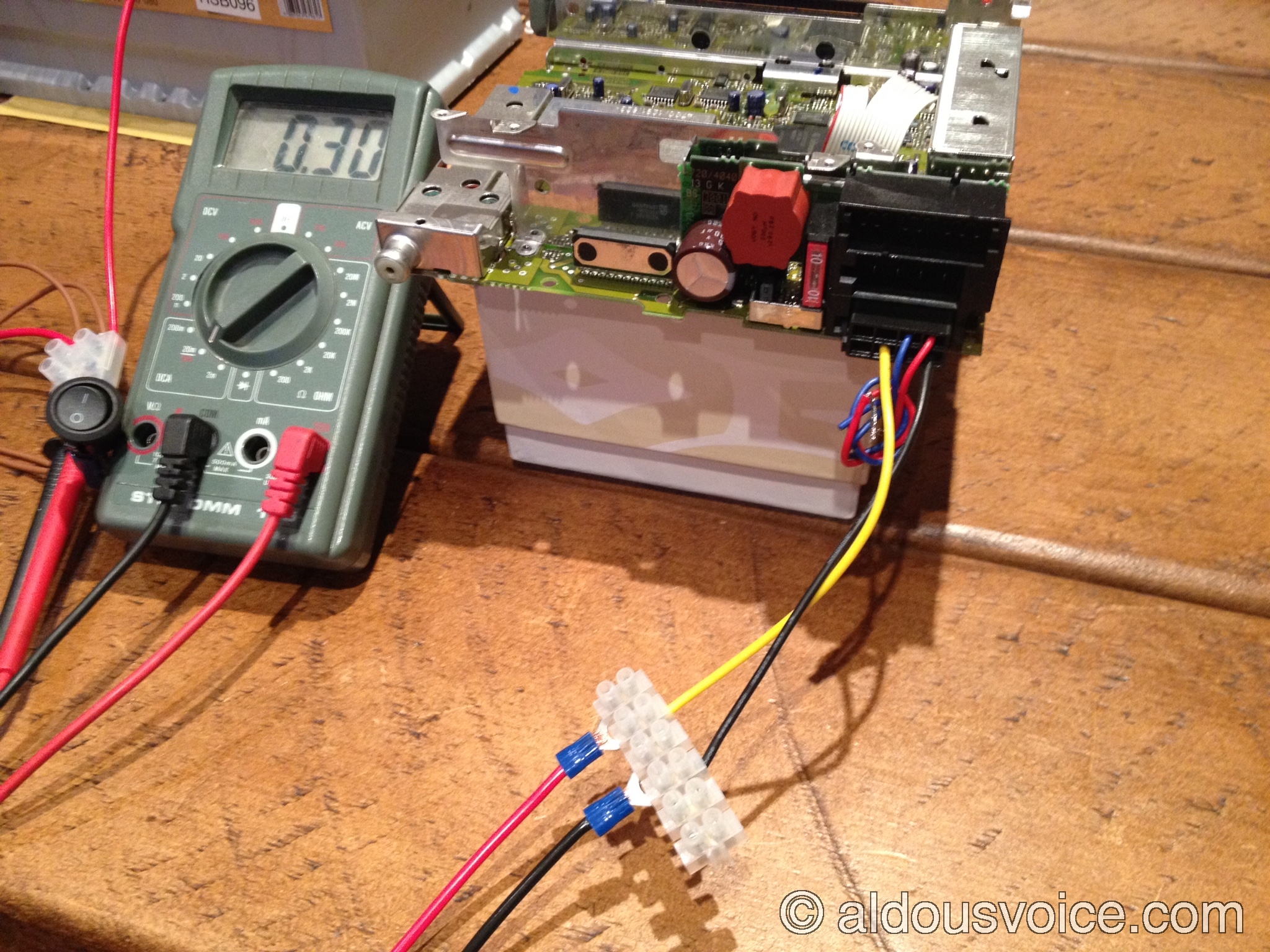 The pin closest to the front of the head unit (circled in red in the photo above) is pin 4, which is permanently connected to a +5V supply even when the head unit is off. Inserting the left-hand removal key all the way in is almost guaranteed to short this pin to ground, which is why it is of paramount importance to switch the battery isolator switch to OFF before attempting to remove the head unit. Shorting this pin to ground will not blow any fuse as the +5V is likely obtained from the main +12V with a DC-to-DC converter, most of which have built-in overload protection. However, other components could be damaged by the current surge and there is strong circumstantial evidence that the reported anomalous current draw that affects these units develops after such a short. When this fault develops, the head unit will appear to work perfectly in all its functions, but it will draw hundreds of mA even when in OFF state. A damaged unit is shown below, with a current reading (when off) of 300mA. Such a high current draw equates to more than 50 Ah over a week and can flatten even a healthy battery if not connected to a battery tender.
