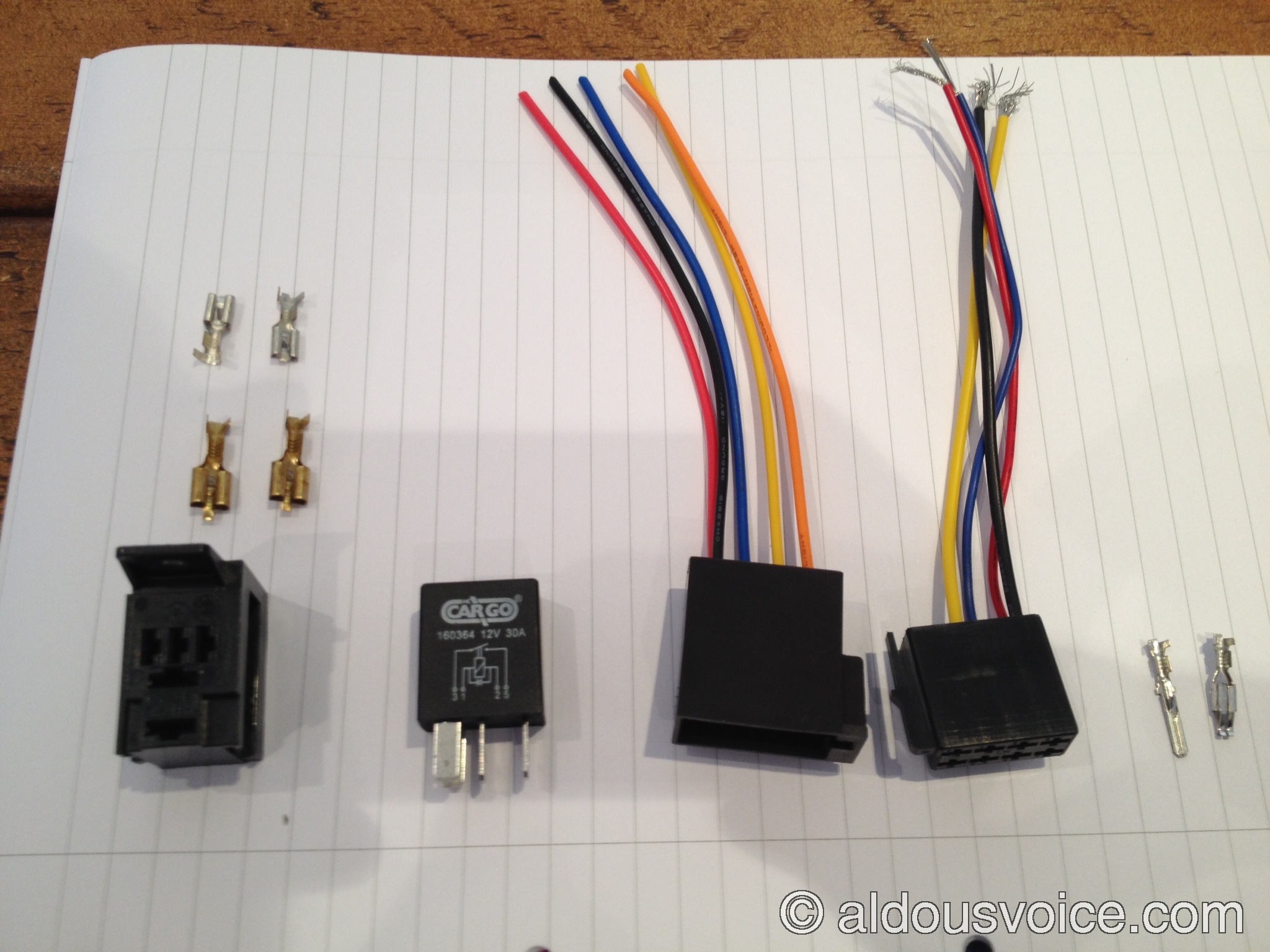 I am not aware of any way of fixing this fault once it develops, but an inexpensive workaround is possible, although it is not without drawbacks. The idea is to intercept the permanent +12V supply to the head unit, which corresponds to pin 4 on connector A, and insert an SPST (normally open) relay to control it, driven by pin 7, which is only live when the ignition is on. An ideal candidate for the relay is the HC Cargo 160364 like the one used in the Remote Control Luggage Compartment Opener circuit. You will also need both a male and a female ISO 10487 type “A” connector, which can easily be bought from car audio suppliers, often pre-wired. Here is a photo of a set of components for this project: