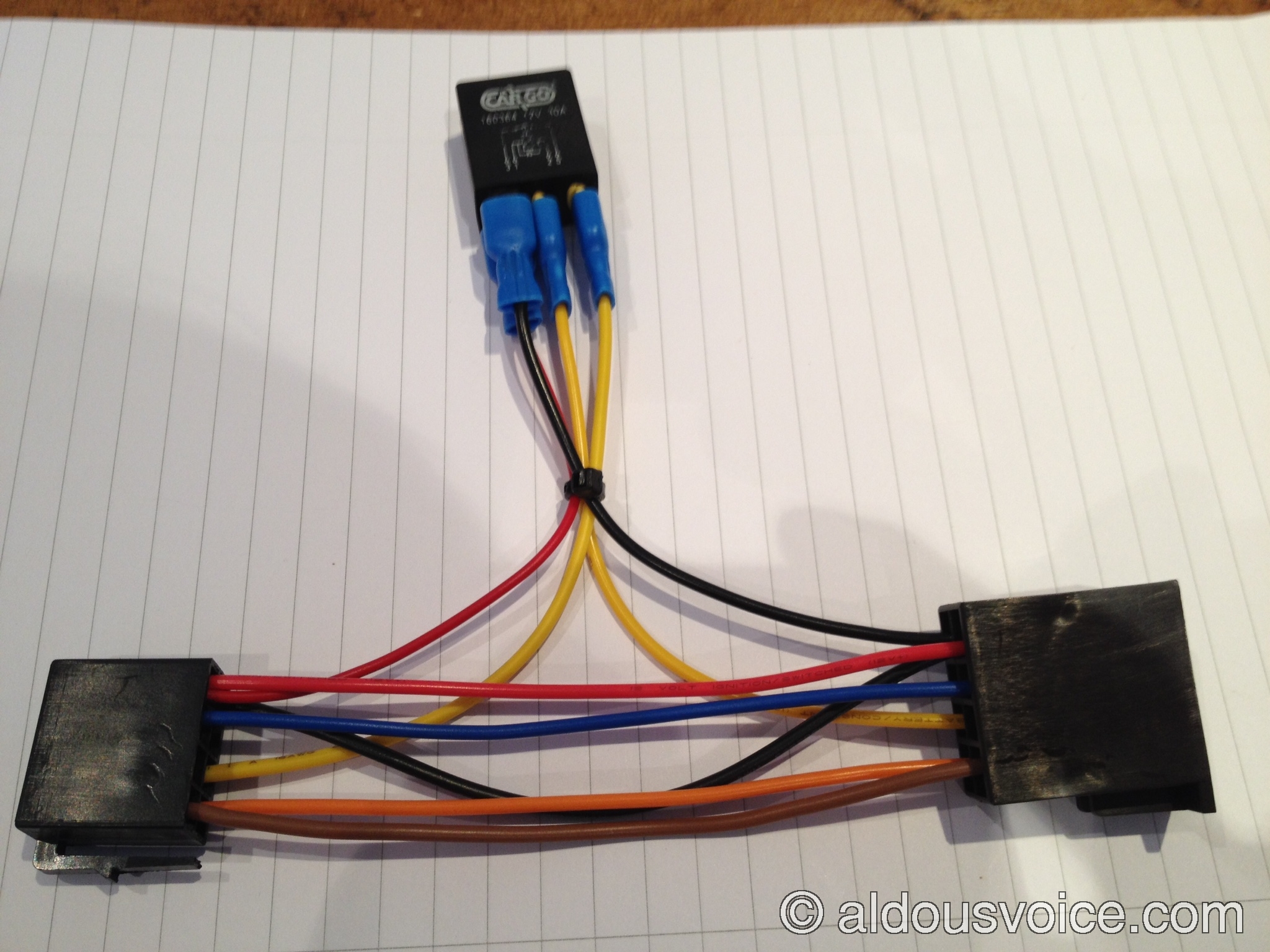 You will now need to make connections between the male connector and the female connector for the following pins, on a one-to-one basis: pin 8 (ground), pin 7 (ignition-driven positive), pin 5 (power supply for, among other things, antenna preamplifier), pin 2 (reversing light signal), and pin 1 (speed signal). Pins 3 and 6 have no connection in the car wiring loom so they are not needed. You will also need to connect an additional wire to pin 8 (either male or female side) and link it to pin 2 (also referred to as pin 85 in ISO relay sockets) of the relay, as well as an additional wire to pin 7 (either male or female side) and link it to pin 1 (also referred to as pin 86 in ISO relay sockets) of the relay. Wires attached to pins 4 on the male and female side must not be linked together, but rather connected to pins 3 and 5 (also known as 30 and 87) of the relay. The finished circuit looks like the one below, where female spade connectors were used to connect to the relay rather than a traditional relay holder.