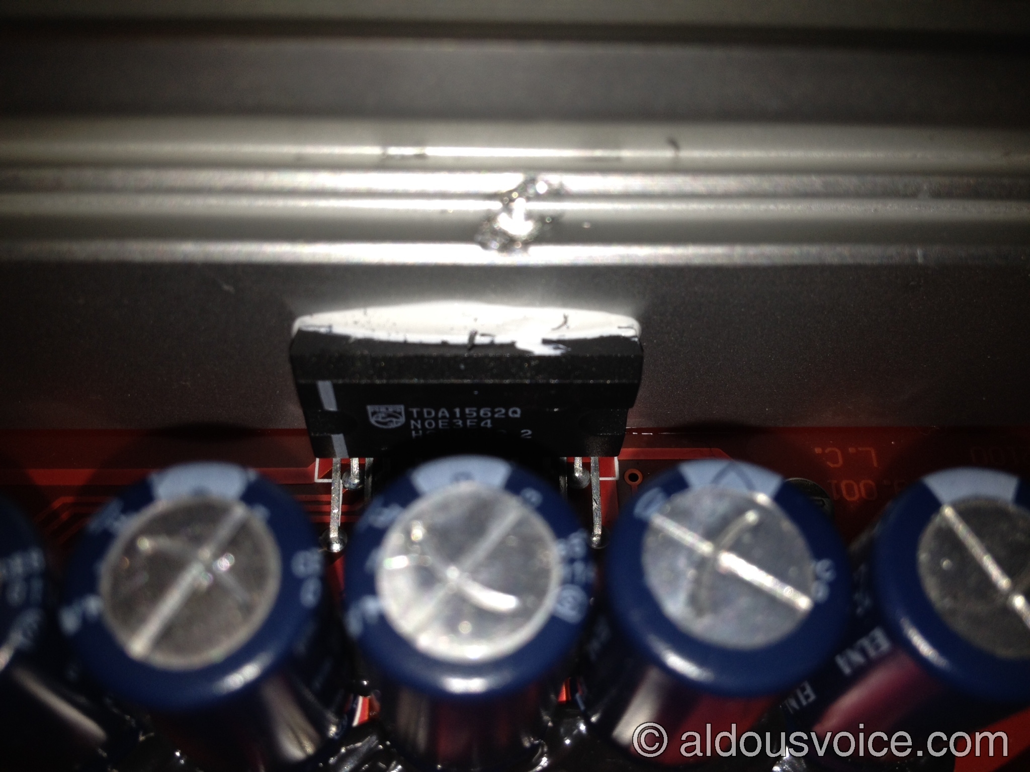 The core of the device is four TDA1562Q monolithic amplifier ICs, which are rated at 70W @ 4 ohm each, albeit with a substantial 10% of total harmonic distortion (THD) at peak power. These are held firmly against the wall of the enclosure (which acts as heatsink) with clips and heat-conducting paste.