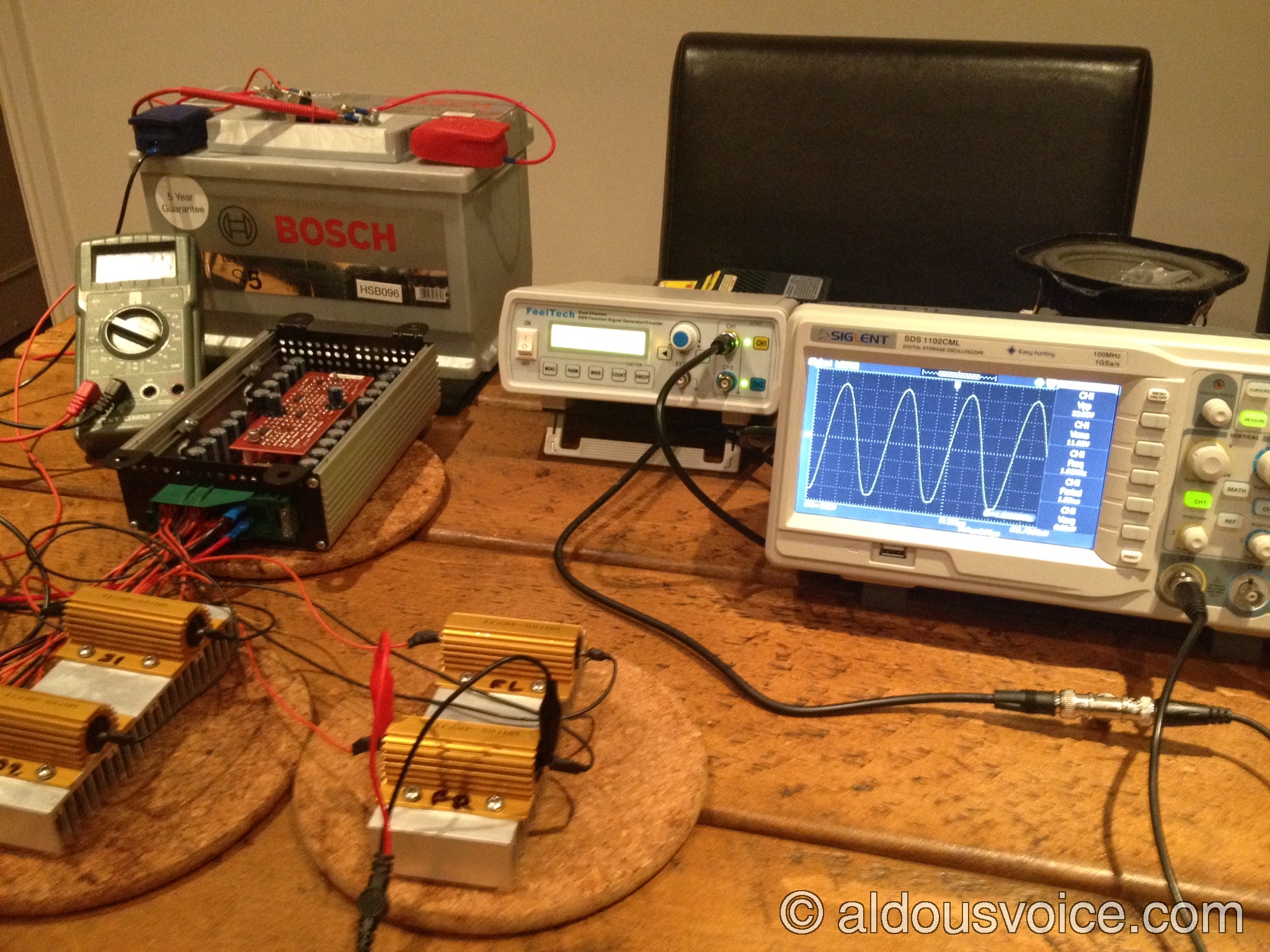 A few caveats need to be given around this measured value. First of all, a real loudspeaker with a nominal impedance of 4 ohms would draw more current than our test 4.7 ohm resistors. Secondly, although care was taken to perform the measurement with the resistors in “cold” state, they do heat up very quickly at peak power (hence the heatsinks) and resistance increases with temperature, which was not factored into the measurements above. Lastly, and perhaps more importantly, the supply voltage here was not regulated, and dipped as low as 12.2V under heavy load. This is representative of a car with its engine off, but lower than you would have in a car with the alternator running – measuring output power in that setup would have probably yielded a higher value.
