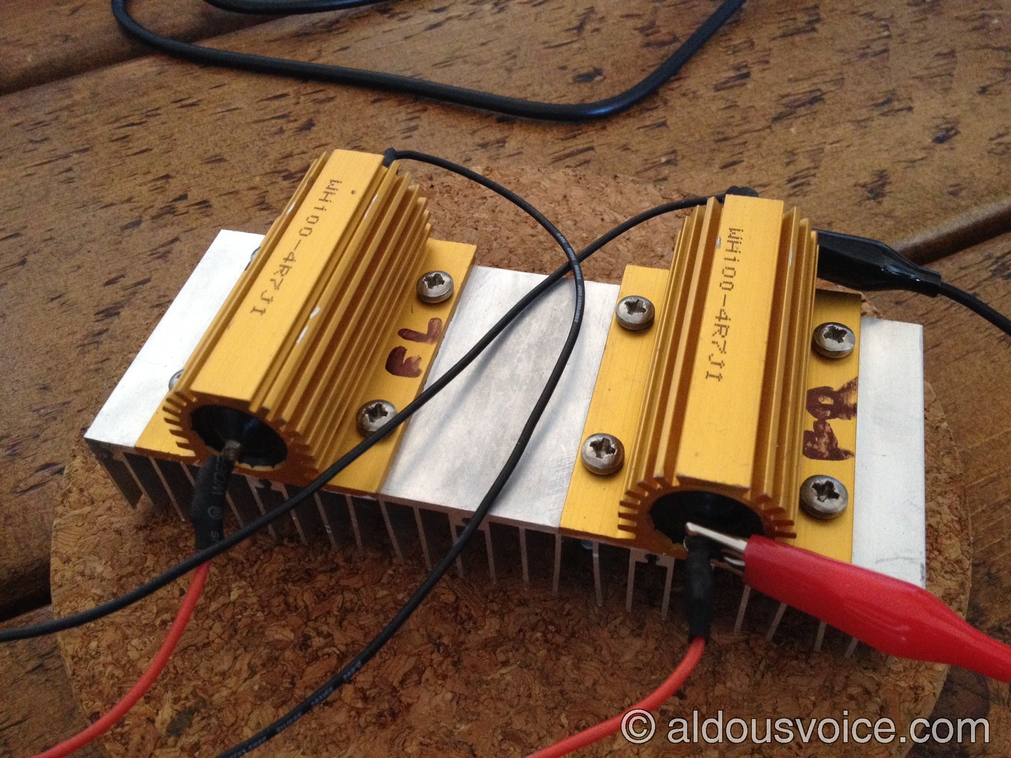 - four 4.7 ohm, 100W, wirewound power resistors mounted on aluminium heat sinks as dummy loads