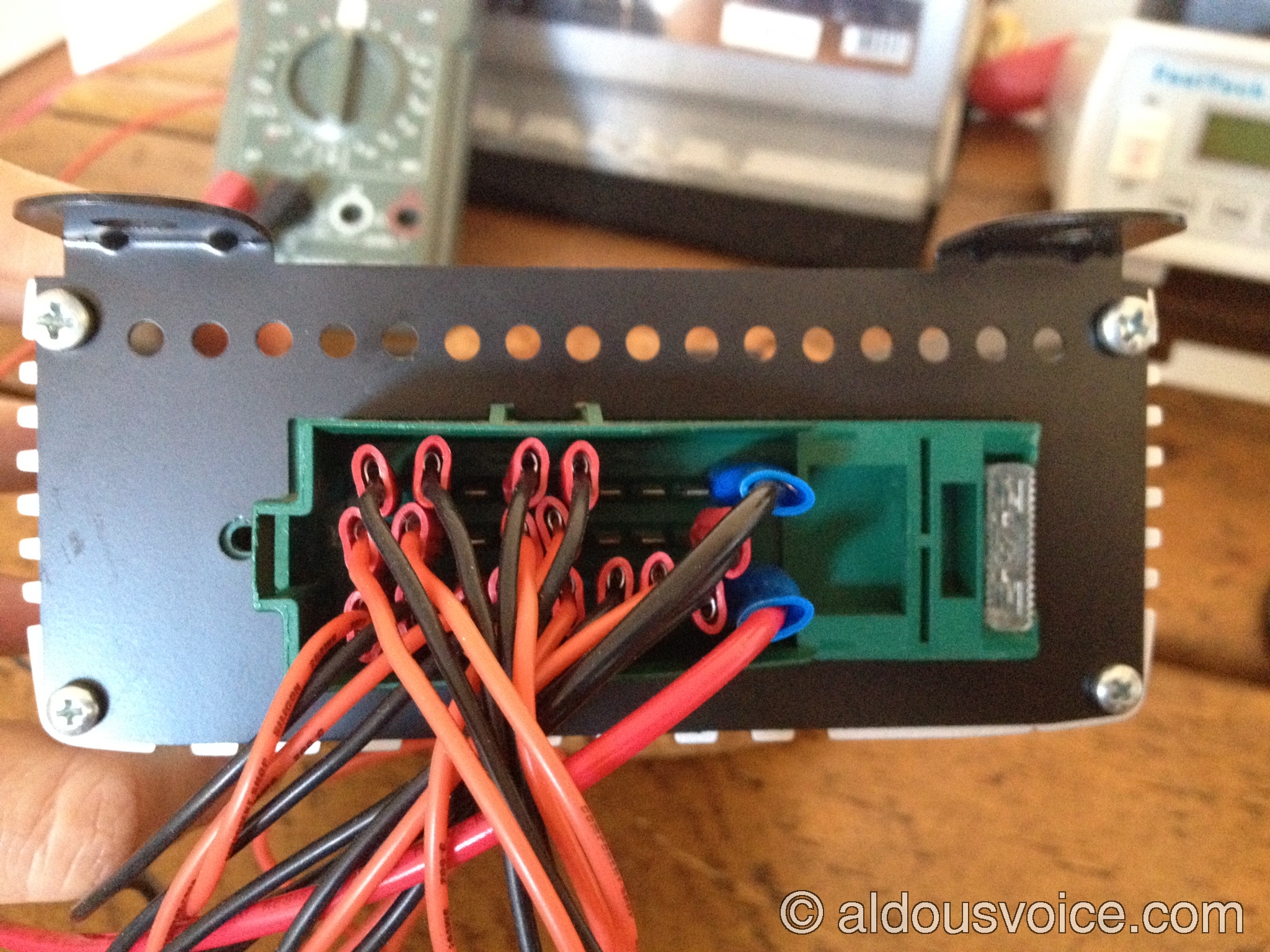 The amplifier was connected to its signal source and to the dummy loads using individual female spade connectors, as shown in the photo below.
