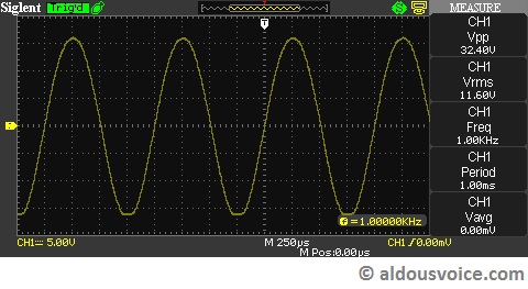 Another test worth performing is a measurement of the max output power the amplifier can operate at. This was done by using a sine wave as input and increasing its amplitude until the output of the amplifier, measured across the load resistor and viewed on the oscilloscope, started to distort or “clip”. At that point, the output power on that channel is given by the square of the root-mean-square (RMS) amplitude of the output wave, divided by the load resistance value. As we’ve seen in the plots above, the amplifier gain is frequency-dependent on all channels, so the maximum power will depend on the frequency. For the purpose of this test, the front-right channel was used, with a frequency of 1 kHz (where the two front channels happen to have identical gain). The measured amplitude was 11.6 V (RMS), which gives (approx) 28 W of peak output power per channel. Below is a snapshot from the oscilloscope with the output wave starting to distort (evidenced by the bottom of the wave starting to square off).