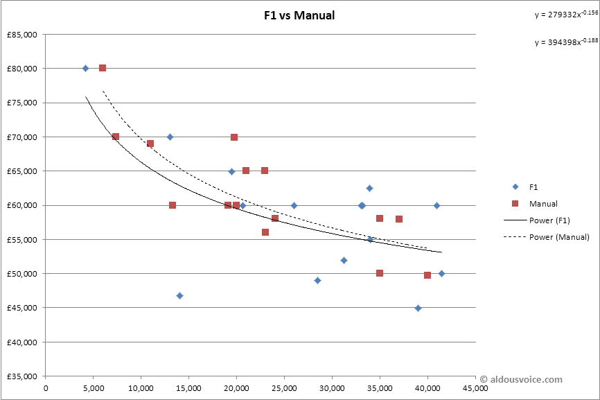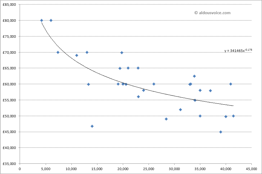 Here’s the plot of asking price vs mileage. Note that the outlier (60k miles, £50k price) that was in last month’s data has dropped out. I wonder if it actually sold near that price…