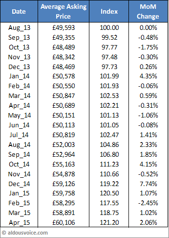 As one would expect in a heated market, average asking prices have risen 2.06% since last month which leaves the index at 121.20 and well above the heady heights of January.