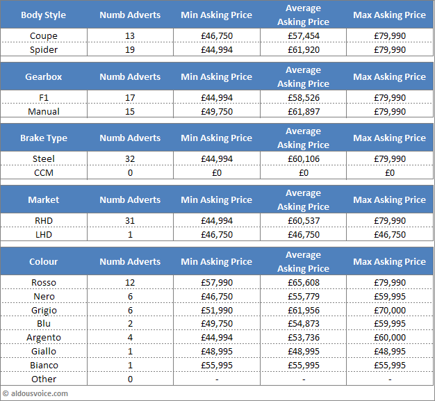 Excellent blog. Some of the best data and analysis for UK Ferraris available in the public domain. Some of the demand for 360-like supercars also seems to be bleeding over to the Gallardo market now in 2015, so it is a bit of a headscratcher why the F430 market is not yet also roaring ahead.