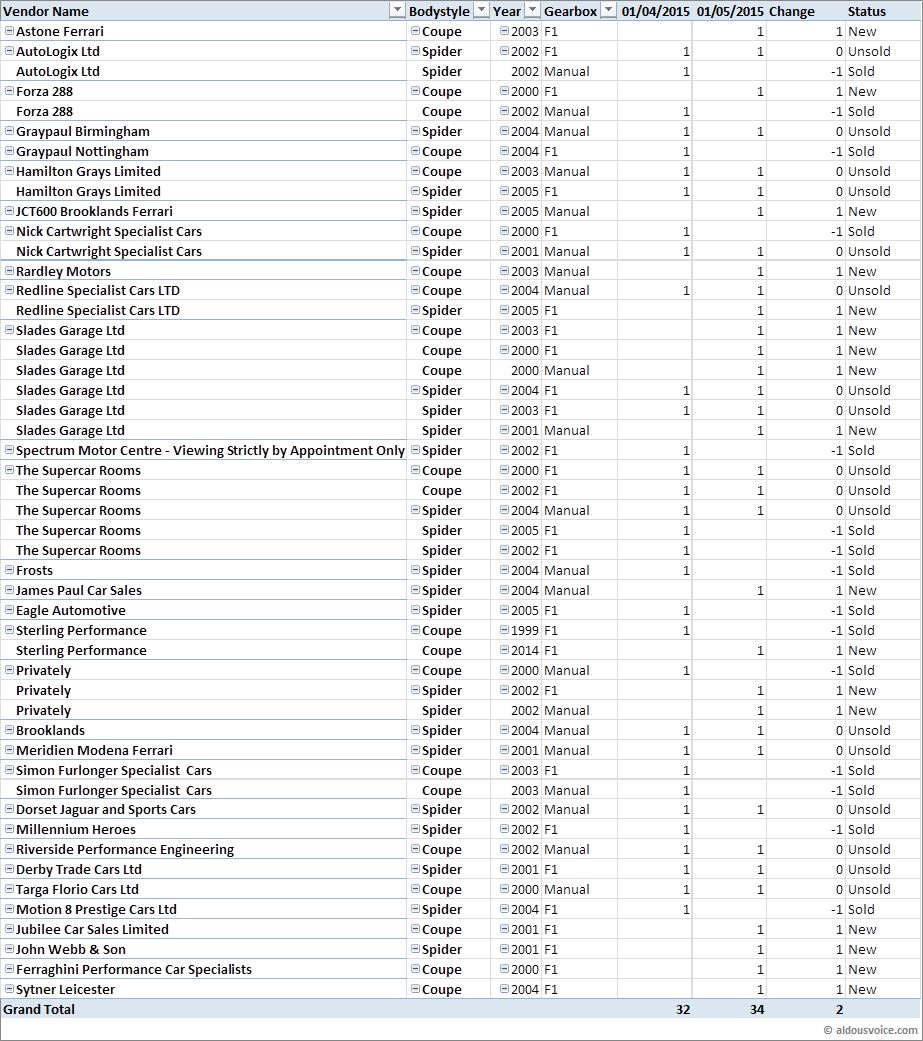 Finally, here’s the big table showing which cars are in and out of the data. Note that both the Frosts car and the Eagle Automotive one seem to have been sold.