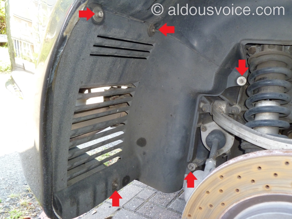 Both rear wheels need to be removed to provide access. Undo the five M6 bolts holding the gravel guards in place – in this picture they are socket head cap bolts but the car was originally fitted with pozidrive screws at the factory. Remove the guards taking care with the rubber seals. Also, take care with the RHS guard as it has an overflow pipe for the F1 fluid attached to the back of it.