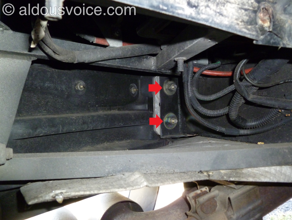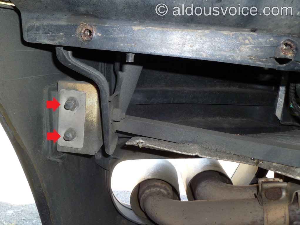 Undo the two (per side) M8 nuts holding the edges of the bumper to the chassis. Make sure to retain the rectangular plate.