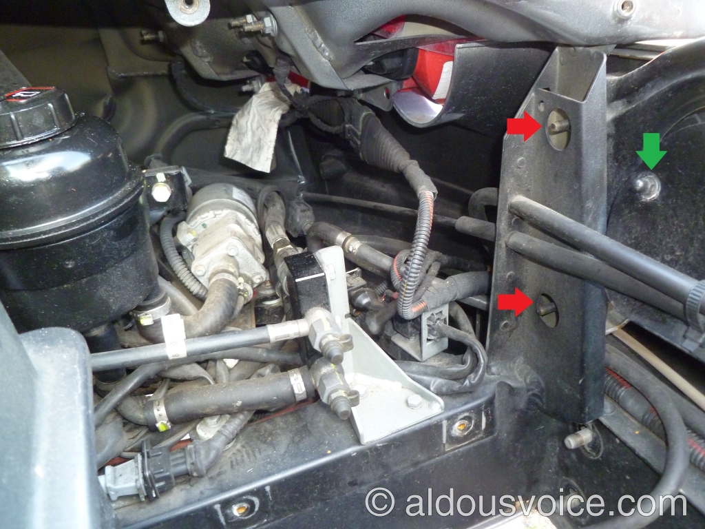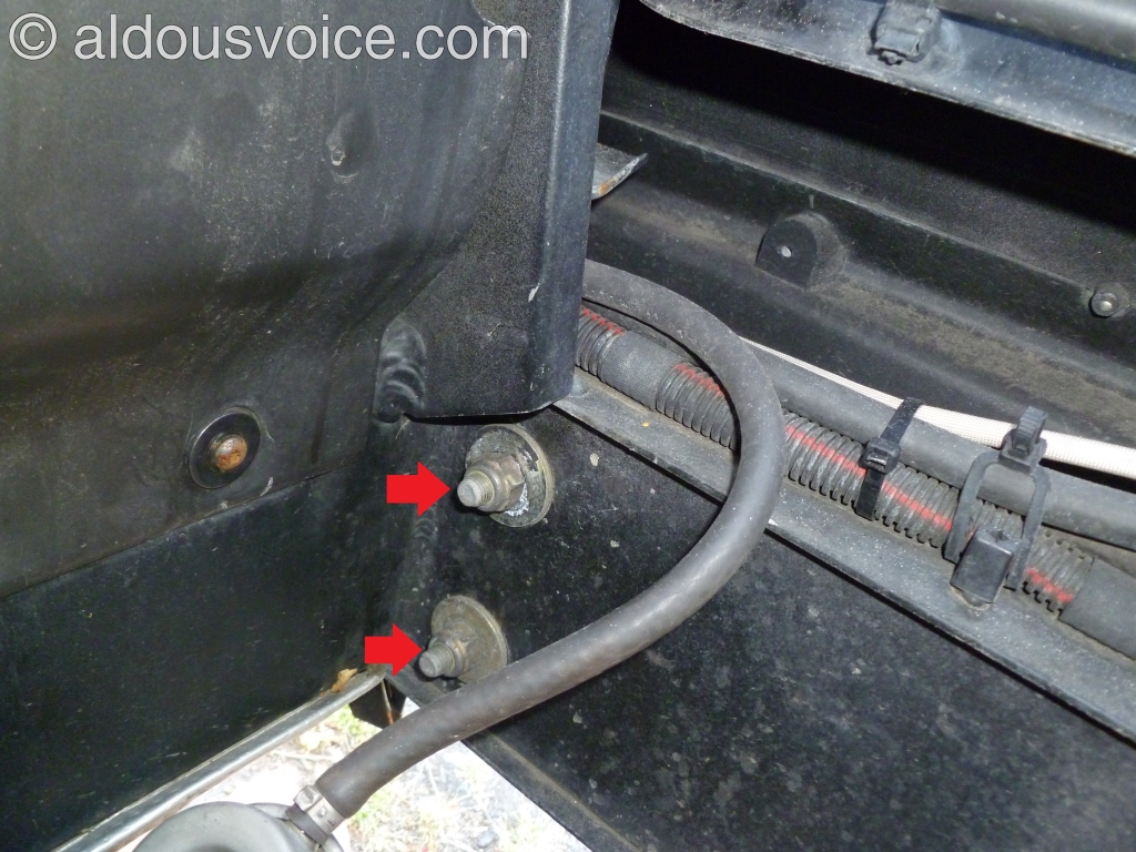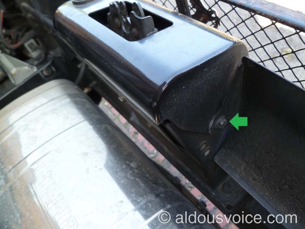 The two louvres that help evacuate the hot air from the engine bay need to be removed. They are help in place with a M5 nut (green in the photo above) and a M5 bolt (below). The RHS louvre has a cable attached to it – rather than remove the cable, the louvre can be moved out of the way.