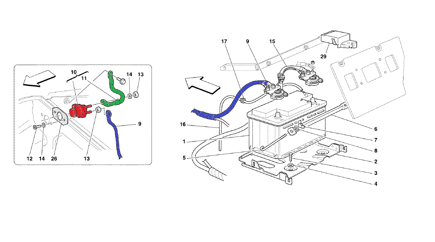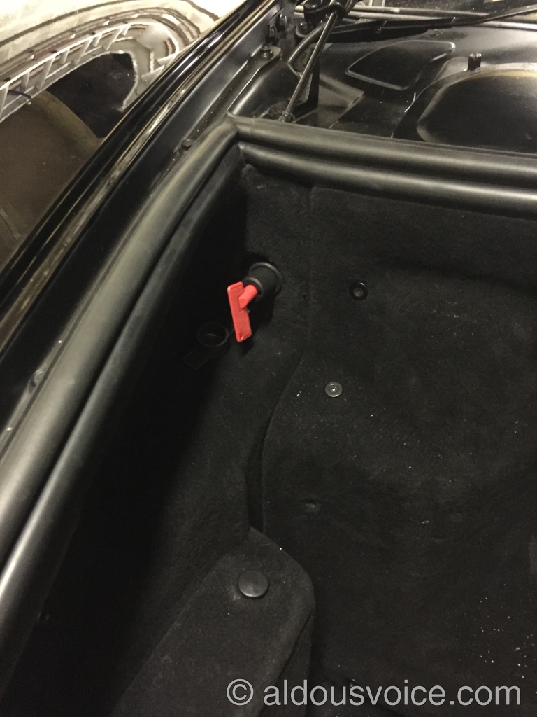 Since the battery is fitted behind a piece of trim in the cabin, Ferrari helpfully fitted a battery isolator switch in the front compartment. This switch (shown in red below) sits between a wire that runs directly to the negative terminal of the battery (blue) and a wire that is attached to the chassis (green). When the switch is opened the battery is no longer connected to the chassis and the power is isolated.