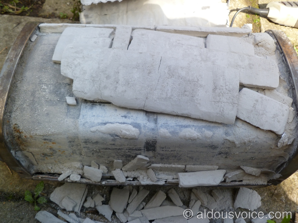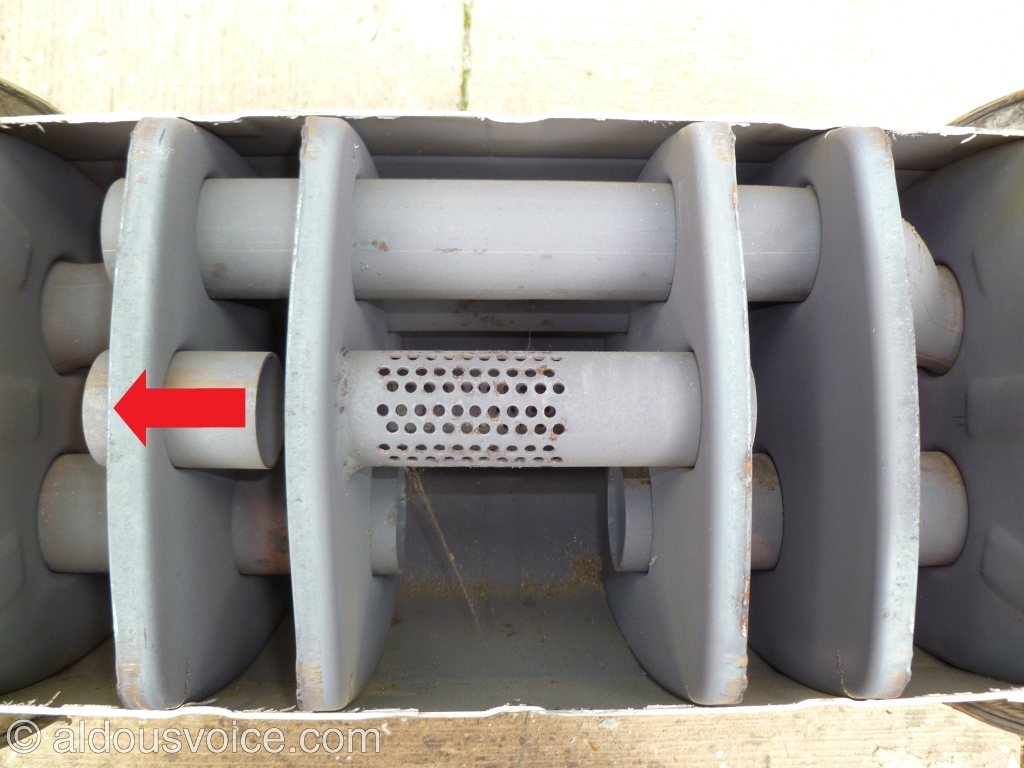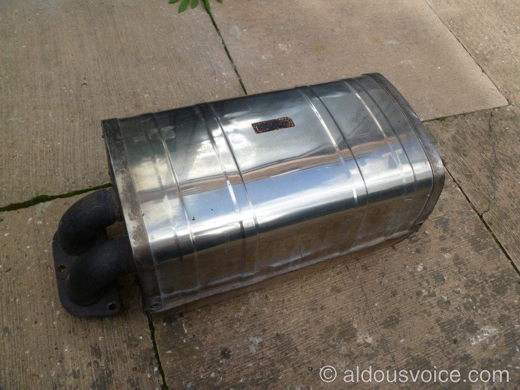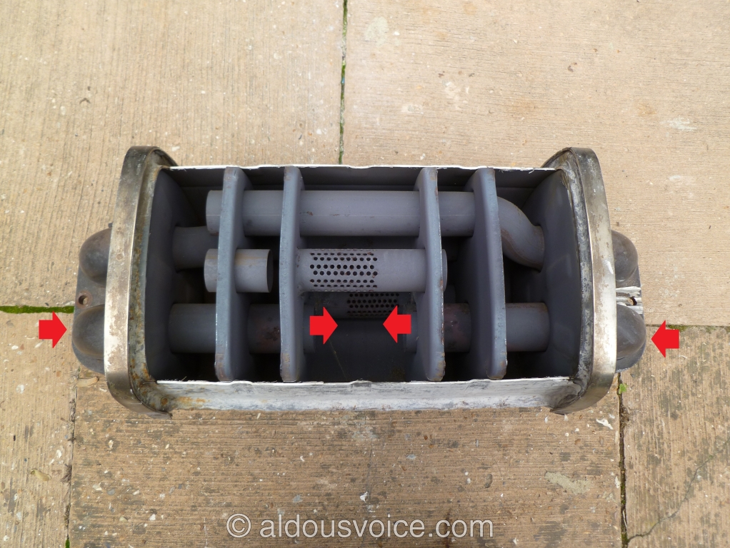 The silencer itself is fairly complex in the way it attenuates the noise of the exhaust gases. Here’s a picture of with the top cut open – there are five chambers.