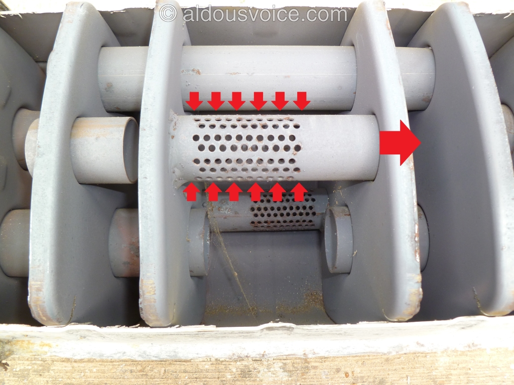 The gases are then passed into the outer two chambers via two short open pipes (note that in the picture below the pipe for the right hand side is out of sight at the bottom of the box).